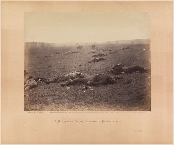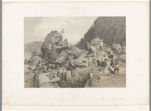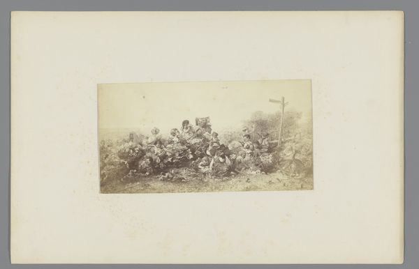 Curator: Let’s turn our attention to this photo reproduction, created sometime between 1890 and 1910. The original painting is by Rosa Bonheur, depicting a shepherd with his flock atop a mountain. Editor: It's wonderfully evocative! The muted palette gives it a serene quality, almost dreamlike. The way the figures blend with the landscape, the shepherd becoming one with his flock and the rugged terrain, creates an interesting texture with soft contrasts. Curator: Bonheur achieved great fame as a woman artist in the 19th century, recognized especially for her paintings of animals. This image, although a reproduction, gives insight into how her work was consumed by a broader public through photography and printmaking. Consider how reproductions like this democratized art. Editor: Absolutely. The texture here is crucial. You can almost feel the roughness of the rocks and the thickness of the sheeps’ wool. Looking at the print itself, I am fascinated by the materials—the paper, the ink. It highlights the labour involved in its production and its role in circulating images to the masses. How does this object help disseminate the paintings? Curator: This photomechanical print served as a relatively inexpensive means of distributing Bonheur’s artistic vision. These images could circulate amongst the middle class. Its worth noting how Bonheur subverted gender expectations too; a female artist achieving fame with subject matter outside the traditional "feminine" spheres. How would people’s expectations play out? Editor: Exactly! The materials speak to me, reflecting how her artistic achievements and ideas circulated within the public domain. Curator: Indeed, this unassuming photograph offers us layers of insight. It bridges discussions about artistic skill and how gender roles shaped access to particular subjects in painting. Editor: It all gets synthesized together in this fascinating printed landscape. The means of distribution shaped our perceptions and now reshapes how we consider Bonheur today.