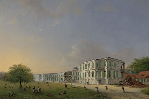 This painting was made by Ernest Alfred Hardouin, showing a house on the Rijswijk, Batavia, now known as Jalan Veteran. Painted with oils on canvas, the smooth surface of the work belies the textures, forms, and history it holds within it. The artist has engaged with the traditions of fine art in his rendering, alongside that of history and place, but what story does it really tell? The house itself is a crisp white structure with clean lines, but in front of it, people wearing traditional clothing are milling about, seemingly at odds with the rigid, modern facade of the building. And behind the guard are lush tropical trees, framing the house as if to remind you of the location in Batavia. The amount of work and its presence speaks to wider social issues of labor, politics, and consumption. The image is about the way of life and the context of colonization. Through the use of these scenes, the painting challenges traditional distinctions between fine art and craft and their meanings.