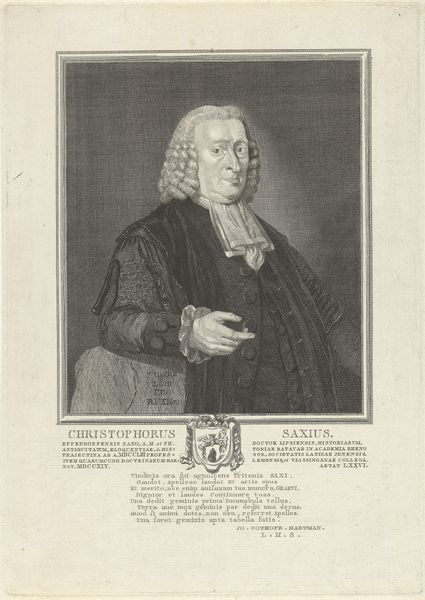 Curator: Here we have a print, an engraving dating from circa 1793-1817, titled "Portret van Jacob van Nuys Klinkenberg". It currently resides in the Rijksmuseum. Editor: My first impression is one of contained solemnity. The monochrome palette lends it a sense of historical weight, while the oval frame neatly confines the subject, drawing attention to the face. Curator: Indeed. The sharp lines created through the engraving technique offer us an interesting contrast with the soft curve of the oval, as well as the softer facial features of the man. It almost feels like a study in contrasts. Editor: Absolutely. Klinkenberg's stern expression seems to echo the somber tones employed by Frederik Christiaan Bierweiler. The high, powdered wig speaks of status and adherence to societal norms of the time, while his clerical garb suggests a deeper devotion. Do you notice the subtle highlights around his face and clothing? Curator: Precisely. They help define his presence in the pictorial space. The details in the engraving, particularly in the wig, are remarkable, creating a rich textural surface within the overall monochromatic scheme. But beyond the pure structure of it, it appears like there may be something more that strikes your interest? Editor: It's more about who this person *was* in society and the meaning it carried then. I'm particularly drawn to the open book in the portrait, a potent symbol of knowledge and learning, but perhaps also of a life dedicated to teaching and faith. The darkness looming over his shoulders feels a bit unsettling, though. Does that add an air of mystery for you? Curator: To me it is a demonstration of shadow as depth, but you raise an interesting point. Without clear external referents in the piece itself, your iconographic lens leads us to consider more context in how we perceive the values the sitter symbolizes. Editor: Overall, this artwork captures both the external appearance and the symbolic representation of a learned man from that era. It sparks an appreciation for the sitter as well as the history of the Baroque print movement. Curator: From my viewpoint, I appreciate how the visual structures—the lines, tonal variations, the careful construction of form—come together. It truly enriches one's experience of this artifact.