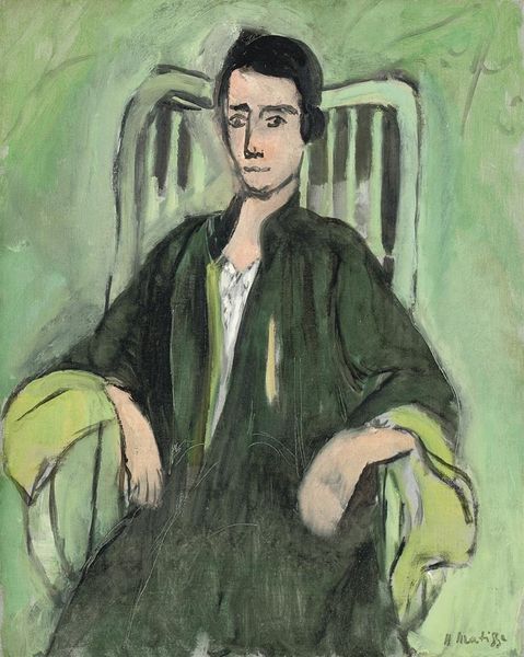 Editor: So here we have "Dan Harris," an undated oil painting by Oronzo Vito Gasparo. I find the sitter's gaze quite intense, and the surrounding details feel rather theatrical. What strikes you when you look at this piece? Curator: The painting’s setting is intriguing. Note the patterned wallpaper and what seems to be a folding screen behind Harris. How might these backdrops, seemingly borrowed from theatre design, comment on the sitter’s persona or the way we’re meant to perceive him? Editor: Interesting question. Do you think that's because it feels a little staged? Curator: It’s quite possible. There's a distinct performative aspect to portraiture itself. Consider also the visible brushstrokes, almost aggressively present, alongside the sitter's rather stylized features. This makes me think about the socio-political contexts in which artists negotiated identity and representation, particularly in early 20th-century portraiture. Whose stories are we allowed to tell, and how? This also challenges traditional notions of accurate representation, don't you agree? Editor: Yes, the stylized features are noticeable, particularly the flushed cheeks. So this flamboyant aspect suggests identity is a constructed concept, perhaps a comment on high society? Curator: Exactly. The 'construction' of the subject, not just on the canvas but within the societal frameworks of the time. This raises the broader issue of how portraiture, as a genre, both reflects and shapes cultural perceptions of status and belonging. Think about who traditionally had access to portraiture and why. Editor: It's interesting to consider it less as a likeness and more as a staged representation shaped by societal conventions. Thanks for pointing that out. Curator: My pleasure! It makes you wonder about all the portraits, even the seemingly simple ones, what kind of societal framework or cultural understanding influenced them.