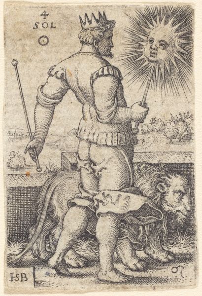 Editor: This is "Sun, plate four from The Seven Planets with the Zodiacs," an engraving by Sebald Beham from 1539. It's printed on paper and shows a crowned figure standing on a lion and holding a sun with a human face. The detail achieved with the engraving is stunning. What's your take on it? Curator: Look closely at the labor involved in producing this print, particularly the repetitive, meticulous nature of engraving. Consider the cost of the materials, the metal plate, the paper, the ink, and the time invested by Beham himself. Each impression required another pull, another expenditure of energy and resources. What social strata would consume such items? Editor: It makes you wonder about the value placed on labor at the time and who would have access to this kind of art. I suppose it wasn't exactly mass-produced like posters today. Curator: Exactly. And the subject matter, associating the sun with power and astrological signs – how does that link to systems of patronage and social hierarchy? Is this print reinforcing existing power structures through its imagery and material form? Consider too how prints functioned as a reproductive medium. Was this about disseminating knowledge, or consolidating elite taste? Editor: So, by understanding the cost of materials and labor, we gain insight into who could own and consume art like this, reinforcing social hierarchies? Curator: Precisely. The print isn't just an image; it's a commodity embedded within a specific economic and social fabric. Examining its materiality allows us to challenge the notion of art existing in a purely aesthetic realm, divorced from the realities of production and consumption. Editor: I hadn’t thought about the material value informing the social aspects so directly before. Curator: The focus on process, materiality, and social context helps deconstruct the myth of the artist as a solitary genius and sheds light on the complex web of economic relationships that shapes artistic production. Editor: I definitely see this engraving in a different light now, thinking about its creation in the context of labor and materials.
