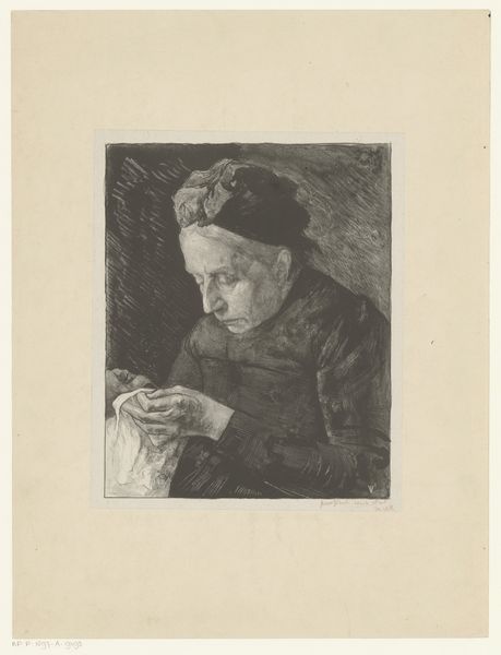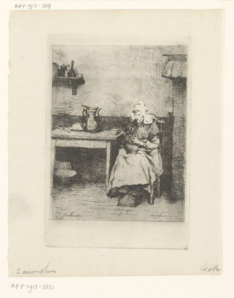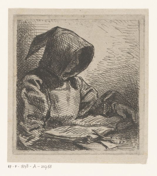 This etching of an old woman reading, teacup at her side, was made by Joseph Dujardin. The artist, working in the etching tradition, used metal plates and acid to create the design. The lines were incised into the metal, and when printed, they hold the ink, creating an image with pronounced lines and subtle shading. The etching medium allows for a great deal of detail, from the delicate lace of her bonnet to the texture of her shawl. The artist emphasizes the contrast between light and shadow, drawing our attention to the woman's face and hands. The texture of the paper itself is part of the image, providing depth and warmth to the scene. This print invites us to consider the labor involved in creating such a detailed image, and how the medium itself is tied to wider social issues of work, class, and consumption. In doing so, it bridges the traditional gap between fine art and craft.