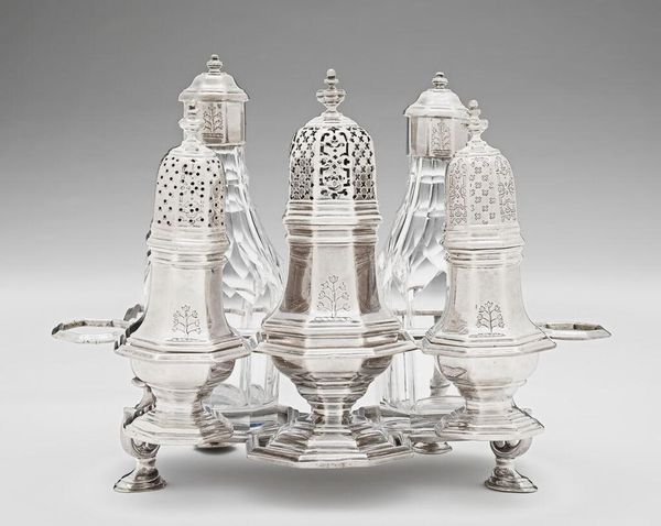 Curator: Here we have a rectangular cruet frame and bottles by Harvey Lewis. Editor: It's dazzling! The glass and silver just sparkle. It feels opulent, and a little fussy. Curator: Lewis was active in London between 1780 and 1835, and this piece speaks to the rise of specialized tableware. Fine dining became a performative art. Editor: Absolutely. And this cruet set, with its precious materials, screams of exclusivity. Who was being served with this? Who was excluded? Curator: Cruet sets were common to display condiments such as oil, vinegar, and spices. The form reflects the rituals and expectations of elite dining culture. Editor: Right, and those rituals were steeped in power dynamics. Think about the labor involved in crafting and maintaining something so ornate. Curator: Precisely. It's a testament to the craftsmanship of the period but also a reminder of social stratification. Editor: Seeing an object like this, so tied to a history of inequality, is a compelling reminder that material culture carries immense social weight.