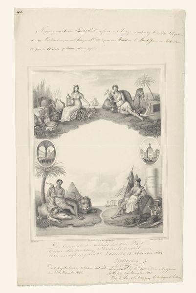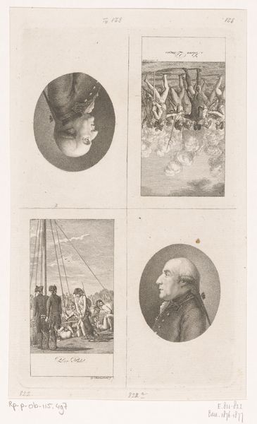Editor: This print from 1803 is titled "Personification of Britannia and eighteen portraits on a plakkaat" and was engraved by James Parker. I find the sharp contrast between the idealized Britannia figure and the stern-looking portraits below quite striking. What compositional elements stand out to you in this work? Curator: The bipartite structure is indeed notable, separating the allegorical scene from the portraits. Let us focus on the upper register first. Observe the tonal range; Parker employs a sophisticated gradation of light and shadow achieved through engraving. How does this tonal modelling contribute to the overall effect? Editor: It almost makes the scene above seem otherworldly and ethereal, while the portraits are grounded in reality. The contrast seems to elevate the Britannia figure, but I'm not sure I understand how the angel playing the trumpet fits into the composition. Curator: The trumpet is an element that invites our interpretive efforts. Are the sounds from it simply celebrating Britannia? The line quality is exceptionally delicate here; look at the soft lines that create the folds of her gown and the texture of the clouds. The composition, especially the arrangement of Britannia, angel and the horses evokes movement and dynamism. Are there further connections we can see through analyzing the medium? Editor: The fact that it's a print suggests that this image was meant for wide distribution, probably celebrating a specific event or moment in British history, right? And also there is an inscription with what appears to be Roman numerals. Curator: Precisely. And consider the function of the portraits. How might their arrangement contribute to the work's meaning? The formal layout lends an air of authority to the work. It creates a harmonious interplay, almost as if these figures collectively embody the ideals represented by Britannia. Editor: So, through the visual language of engraving, composition and form, Parker’s print speaks of British identity and perhaps the strength found in unity during that era? Curator: Yes, and hopefully looking deeper at the materiality of the piece, such as its line work and use of tonal values will give a fuller image and appreciation of British artistic trends.