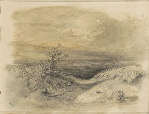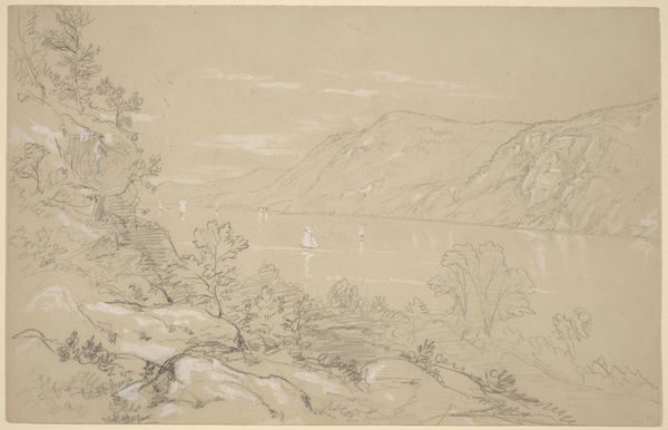 Curator: Eduard Wilhelm Pose’s “Italian Landscape,” a watercolor drawing residing here at the Städel Museum, immediately strikes me as dreamlike, a vision veiled in sepia tones. Editor: Absolutely. It's an ode to nostalgia, wouldn't you agree? The way the hazy washes blend together, almost erasing the details, feels like recalling a memory from a great distance. The overall composition projects romantic longing, wouldn't you say? Curator: I see your point. Indeed, the interplay of light and shadow, created through masterful manipulation of the watercolor medium, certainly evoke a mood of longing and perhaps, even the sublime. Look how the composition leads the viewer's gaze from the rocky foreground to the distant mountains and the vague architectural outlines sitting next to a body of water. Notice the subtle brushwork that differentiates the foliage. Editor: Subtlety is its strength, and the muted palette emphasizes the serenity. Yet, beneath the tranquil surface, the structural composition—the jagged rocks juxtaposed with the distant, orderly town—suggests a dialogue between untamed nature and human civilization. Almost a kind of reverie of Romanticisim. Curator: A binary opposition, as it were. Precisely, Pose’s Romantic sensibilities clearly resonate with the artistic ideals of his era. The calculated arrangement of elements and restricted tonal range serve not only to capture a picturesque scene but also to imbue it with symbolic weight. I see, reflected through nature itself, society emerging. Editor: It reminds me of Turner's watercolors, the way he captures light, and atmosphere. But there's also something uniquely German about the way Pose imbues this with emotion. Curator: I concede the stylistic resemblance. Now, let's not overlook how the work speaks to a broader cultural phenomenon: the 19th-century artist's pilgrimage to Italy in search of beauty and inspiration, with particular attention paid to the arrangement of line, shape, form and color, a sophisticated interpretation of Italian essence. Editor: Ultimately, it is more than a visual document, wouldn't you agree? More a visual poem or dream, filtered through a deeply personal lens. Curator: A fitting synthesis, truly.