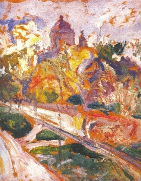 Oleksa Novakivskyi made this painting, Self Portrait with Saint George Cathedral, using oil paint, though we're not sure exactly when. The first thing that grabs you is the color: yellows, oranges, pinks and lilacs. Look at the texture, how the paint is dabbed on, thick in some places and thin in others. This kind of mark making is really physical. The building itself seems to grow out of the landscape with the same brushstrokes and colors used for both. It's like the artist is saying that everything is connected. Look at how the tree in the foreground is a swirl of paint strokes, it's as if Novakivskyi is inviting us into the painting, to experience the scene as he did. It feels like a cousin to the work of Van Gogh, but with its own unique sense of place and light. It reminds us that art isn't about making something perfect, but about seeing the world in a new way.