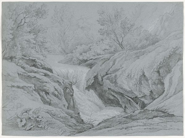 Editor: Here we have Pierre Louis Dubourcq’s “Rocky Landscape with Waterfall,” a pencil drawing, likely done sometime between 1830 and 1858. It’s incredibly detailed. What strikes me most is the contrast—the solid, almost imposing rocks against the fluid, almost ephemeral water. What do you see in this piece? Curator: What I see is the raw, untamed heart of Romanticism beating on the page. Those rocks, you’re right, they're formidable. I bet Dubourcq felt it too. Artists were practically falling over themselves to capture the sublime – nature's power to both inspire and terrify. I mean, imagine standing there, sketching away as the waterfall roars, spray hitting your face... Did Dubourcq want us to feel small, or to admire the indomitable force on display? Editor: That’s interesting. I hadn’t considered the feeling of smallness. But it definitely has a sense of grand scale, even within this small drawing. Does the pencil medium somehow downplay that though, do you think? Curator: Ah, that’s perceptive. A grand landscape rendered in humble pencil— a contrast, yes, and a very clever one. It forces you to lean in, examine the detail. He doesn’t bludgeon you with grandeur, he whispers it. But look at those scratchy, frantic lines in the water; they are pure energy! Do you see it? Maybe pencil gave him freedom to express movement in a very intimate way. Editor: Absolutely! Now I see it— it almost invites you to touch the water, like you could smudge the drawing and set the whole scene in motion. Curator: Precisely! Art isn't about flawless representation; it’s about transmitting a feeling. It seems to me that both are trying to process that feeling in front of this small artwork. It's wonderful, isn’t it, how a simple landscape can make us contemplate the essence of nature? Editor: It is! I definitely see this drawing in a new light.