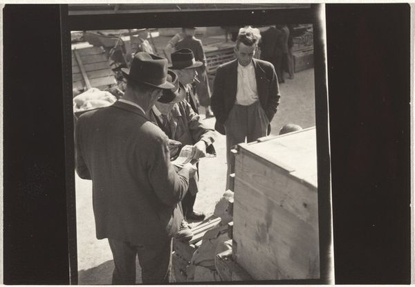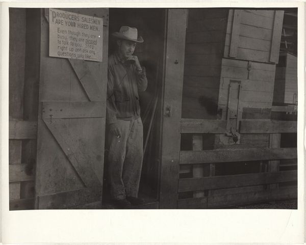 Robert Frank captured this untitled photograph, known as "Cafeteria line--San Francisco," using black and white film. The composition is immediately striking with its raw, grainy texture and stark contrast. Three figures dominate the foreground, each framed by the horizontal thrust of what we assume to be the titular cafeteria line. The arrangement of the figures creates a spatial tension, almost claustrophobic, pushing them to the forefront. Frank’s use of shadow and light emphasizes the harsh realities of his subjects, their faces etched with weariness. The image becomes a commentary on the structural forces that shape individual lives. This photograph, with its unvarnished depiction of everyday existence, invites us to question the structures of representation itself, challenging any fixed meaning.