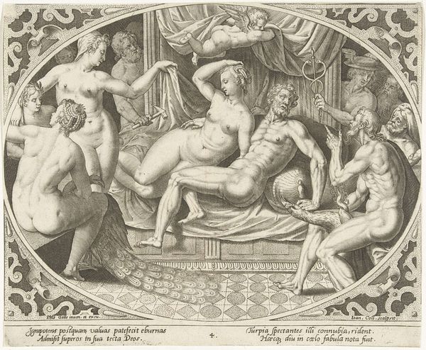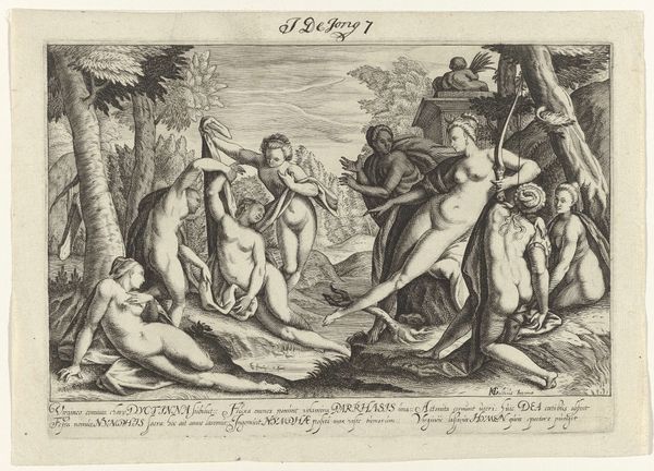 Curator: Here we have "Bas-relief met Diana en Callisto", an engraving made in 1727 by Matthijs Pool and housed right here in the Rijksmuseum. What's your initial reaction to it? Editor: The stark contrasts in this engraving immediately strike me, there’s almost a sculptural quality, achieved with a very clever play of light and shadow. And it feels incredibly intimate, like a stolen glimpse into a private scene. Curator: Exactly! Let's delve into the materials and process a bit. Engravings like this involved a skilled artisan meticulously cutting lines into a metal plate, inking it, and then pressing it onto paper. This process democratized image-making at the time, making these mythological scenes accessible to a broader public than paintings. We must note the engraver’s dependence on reproductive commissions in workshops in this era. Editor: Agreed. And focusing on the visual construction, notice how the artist uses the formal elements: the delicate lines to define the figures’ contours, the denser hatching to create depth and volume? Diana is visually separated by that compositional triangle between her gaze and her body language as well. The composition invites a careful reading of each figure and the overall narrative. Curator: Precisely. Pool wasn't merely replicating an image; he was re-interpreting a classical narrative within the socio-economic framework of printmaking. It reveals assumptions and social structures inherent to 18th century culture via mythology in ways we might understand through labor practices, material choices and patronage relationships of workshop practices. How this art object served consumers must not be disregarded. Editor: Absolutely. The figures feel Mannerist but the Baroque flair comes through especially in Diana's regality. You can almost feel her presence based solely on visual cues, but that reading still requires careful looking that privileges sight and experience, rather than external factors alone, of course! Curator: This piece provides fascinating insights into how myth operated in the daily lives of people beyond wealthy collectors through an accessible reproduction for a budding middle class. Considering the original context really amplifies my experience with its visual features. Editor: True, contextual elements clearly do give deeper meaning. However, engaging with its pure formalism allows its meaning to exist on its own, separate from any outside ideas we might put upon it! I guess this means it stands tall regardless.