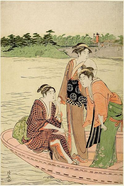 Curator: What strikes me most about this woodblock print, "Ferry on the Rokugo River," dating to around 1784 and attributed to Torii Kiyonaga, is its tranquility. Editor: I agree; it’s imbued with such stillness. But more than tranquility, I sense a story. Look at how their eyes converge on some unknown detail just outside our view. What could it signify? Curator: Kiyonaga, like many artists of the Ukiyo-e school, often depicted scenes of everyday life in the Edo period, with a focus on the courtesans and beauties of the time. Perhaps their focus carries subtle cues to the cultural significance attached to even ordinary scenes. Notice the detail in their garments. Editor: Their clothes offer status markers, certainly, with intricate patterns signaling social standing and seasonal relevance. It’s a quiet form of cultural performance, but there's also something archetypal at work here; I feel as though these figures have always existed. The flowing robes and deliberate gestures evoke images of goddesses. Do you feel it? Curator: It’s intriguing you frame it that way. I see how these visual symbols lend them an air of timelessness. These kinds of woodblock prints gained immense popularity in Japanese society, often reflecting or influencing tastes and fashions. Think of them as early forms of mass media, shaping cultural ideals of feminine beauty. Editor: Precisely! It brings into question who held the gaze. Were these images shaping the culture's view on feminine representation, or simply reflecting it back? Curator: Both, undoubtedly. The artist himself had great influence. Torii Kiyonaga’s style, compared to predecessors, often emphasized a sense of serenity and elegance that mirrored shifts in societal norms during a time of relative peace. It is not merely documentation; there’s a sense of refined sentiment here. Editor: Considering it's an image intended for mass consumption, the art offers such a subtle and nuanced conversation, isn't it? I'll carry with me an altered view about such images—ones more attuned to their intrinsic complexity. Curator: Likewise; understanding the interplay between cultural values, artistic expression, and how they echo through images over time provides new insights, always.