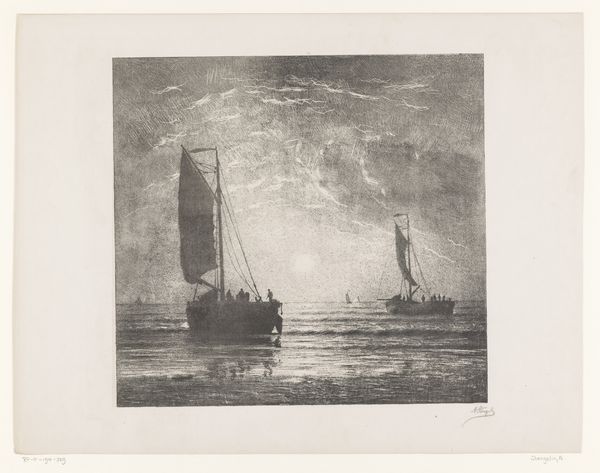Curator: Here we have Carel Nicolaas Storm van 's-Gravesande's etching from 1870-71, titled "Boot op de Adour," or "Boat on the Adour." Editor: My initial impression is one of stillness, even melancholy. The monochrome palette and quiet composition create a very subdued mood. Curator: Indeed. Note the artist's expert handling of line and texture, particularly in the reflection of the boat on the water's surface. It exemplifies his remarkable talent with the etching needle. Look closely at the varying densities of lines and how they shape our perception of light and shadow. Editor: But that stillness could be deceptive. This image was produced shortly after the Franco-Prussian War, which impacted the Netherlands profoundly. The placid scene might, perhaps, mask a sense of uncertainty about the future, a longing for peace. Notice the background; a faint depiction of buildings clustered on the bank opposite hints at a larger town. Curator: An intriguing reading. One could argue, however, that 's-Gravesande was more concerned with purely formal elements. His devotion to Dutch Golden Age landscape traditions placed emphasis on the visual interplay of line and form. It's hard to overlook his debt to earlier Dutch masters like Rembrandt in his creation of atmospheric light. Editor: That earlier context, while important, doesn't negate a contemporary reading. For whom was this image created? How did class and societal changes affect the interpretation of landscapes? The solitary figures on the boat prompt one to consider histories of labor, mobility, and perhaps even migration within the specific context of the Adour region. Curator: I see your point about accessibility, yet one must appreciate the skill in translating three dimensions into two, playing with focus, using tonal variations to create a sense of depth. These technical aspects make the artwork fascinating in its own right. Editor: Perhaps both are intertwined. The skill and the composition could reflect not just artistic talent but a specific cultural outlook rooted in a period of intense transition and social re-evaluation. Thank you for helping me explore that perspective. Curator: The pleasure was mine; it’s always interesting to delve into how we might better view and understand a given object and period.