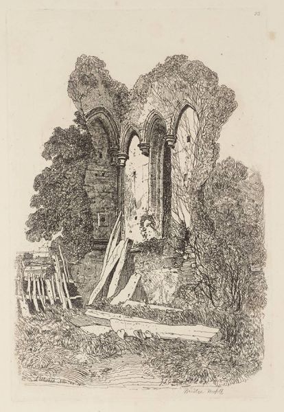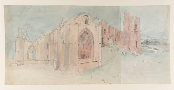 Curator: What a melancholic scene! It whispers of history lost, doesn't it? Editor: Indeed. What we're looking at here is Emanuel Leutze's 1841 watercolor and ink drawing, "Cathedral Ruins, Bacharach." It's a Romantic-era landscape piece, showcasing the skeletal remains of a cathedral perched dramatically above a hillside town. Curator: Skeletal is the perfect word. The color palette feels muted, almost ghostly, except for those almost blood-red hues in the towering, fragmented cathedral walls. Is that a symbolic touch? Editor: Undoubtedly. Red, of course, can represent sacrifice, passion, and in this context, perhaps the martyrdom of faith in the face of time. Cathedrals, from an iconographic point of view, always represent the embodiment of spiritual aspirations and societal values, but here its ruined state powerfully hints at the ephemeral nature of even the grandest human endeavors. It almost seems like the architectural corpse, isn't it? Curator: Definitely. But I find beauty in it. This isn’t just about death, is it? The tree, so sensitively drawn beside the cathedral feels vital, suggesting persistence, life sprouting amidst decay. And look at how Leutze uses the washed lines to bring out all the intricate detail on what’s left standing of that soaring architecture. It has its own majesty, don’t you think? Editor: Precisely. Ruins possess an undeniable allure; they serve as potent reminders of our shared history. They ask profound questions of the viewers regarding their perceptions of mortality and transformation and even hint towards how nature slowly reclaims that manmade construction. Leutze highlights that dynamic with particular emphasis, I think. The steps seemingly leading nowhere represent human ambition facing the inevitable decay. Curator: So it is about accepting change… even reveling in that strange beauty of gradual transformation, the poetry of impermanence. Like appreciating the sunset, or how it smells just before a rain! Editor: A beautiful image, full of contemplation and delicate suggestion. It holds space for the viewer.