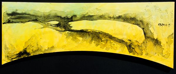 Curator: Let’s take a moment to consider this striking watercolor painting by Mostafa Dashti, simply titled "Untitled," created in 1989. Editor: My first impression is a sense of stark isolation. The landscape seems barren, almost lunar. Curator: Indeed, the composition employs broad washes of color and very little detail. The color scheme—predominantly yellows and greys—suggests a harsh, perhaps desolate environment. Notice how Dashti uses the white of the paper itself to define the horizon line and suggest vast distance. Editor: The tire tracks leading into the distance evoke a history of human presence and a poignant echo of human absence. Are the tires themselves stand-ins for human figures? It is almost as if the artist captured that abandoned detritus along some forgotten roadside, representing an allegorical view of industrial impact on nature. Curator: A compelling interpretation! Formally speaking, the watercolor medium allows for a remarkable interplay of transparency and opacity. The brushstrokes themselves become integral to the visual experience. Notice that we do not get definitive, precise edges in this work but translucent washes; therefore, a lot of this work hangs on those material interactions. Editor: I find it incredibly evocative. The landscape carries a somber narrative—a world touched by time and abandonment. There's a deep feeling of melancholy lingering here, as if these objects speak of dreams deferred or realities gone awry. Curator: The use of watercolor really contributes to that feeling; its fluidity perfectly conveys impermanence and transition. In terms of structure, the horizontality dominates—flat, even. The composition guides our eye through space and enhances this narrative of melancholic abandonment you observed. Editor: Yes, it's as though each brushstroke carries not only color but a story, embedding memories of past travelers or narratives long-forgotten in its delicate washes. Curator: A stark and resonant piece. It's amazing how much emotion can be evoked through such spare visual elements. Editor: Yes, those objects aren’t only parts of an abstract painting, but echo throughout collective experience, too.