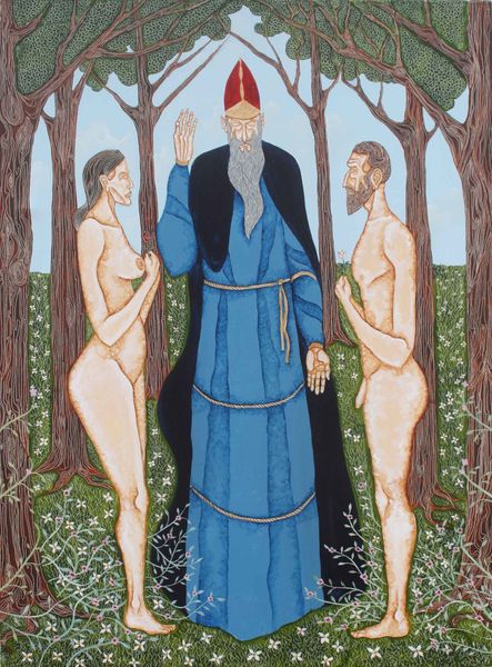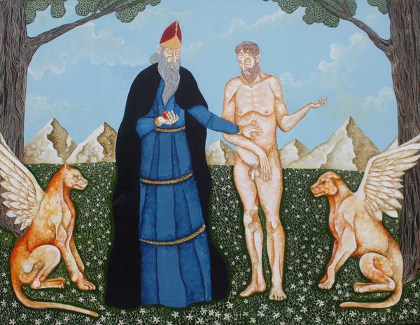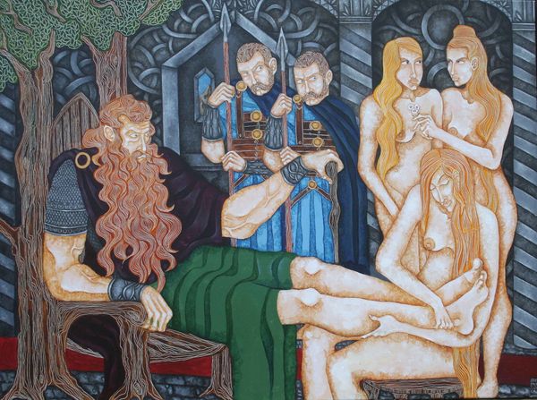 Joe Machine’s large painting, St Dunstan and the Devil, continues the artist’s exploration of religious and mythical themes. Machine, who was born in 1973, lives and works within a social context marked by rapid change and cultural fragmentation. In the piece, Machine reimagines the medieval tale of Saint Dunstan, a historical figure who, according to legend, confronted the Devil. In Machine's version, the Devil is a grotesque figure, a foil to Dunstan. Dunstan's triumph is not merely a victory of good over evil, it’s a statement about the enduring power of faith and the ability of the individual to confront and overcome inner demons and external challenges. The use of religious symbolism is interwoven with the artist’s personal narrative and the broader cultural context. Machine develops alternative narratives, and prompts us to question the nature of belief and the role of spirituality. We are asked to explore the emotional and psychological dimensions of faith in a secular world.