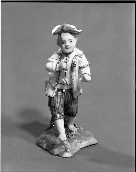 The Frankenthal Porcelain Manufactory made this delicate sculpture of a flute player from porcelain. Porcelain is made by combining kaolin clay, ground granite, and feldspar, materials first refined in China, and closely associated with wealth and trade. Notice the smooth, white surface and the fine details, achieved through careful molding and firing at high temperatures. These figures were often made in multiple parts using molds, and then assembled. It was a painstaking process that divided labor, with some workers specializing in molding, others in painting, and so on. The figure's elaborate costume, with its ruffled sleeves and striped trousers, would have been carefully painted by hand. While the sculpture captures a moment of leisure and refinement, it’s worth remembering the extensive, often unseen labor required to produce such objects. The material, production process, and artistry evident here are all part of its story.