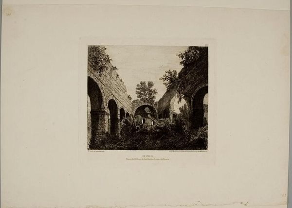 Curator: Gmelin's "View of the Marzia Aqueduct, the Claudia, the Anio Nuovo, and the Anio Vecchio at Tivoli" evokes a sense of melancholy to me. It's as if the weight of history is literally bearing down upon the landscape. Editor: I see what you mean. Ruins often carry that romantic weight. Look at how the aqueducts, though strong in their architecture, are being overtaken by foliage. There’s a dialogue here between nature and the legacies of human engineering. Curator: Absolutely. The image highlights the way power structures, symbolized by the aqueducts and their function within a specific time, are reclaimed over time. It touches upon a critique of civilization itself. Editor: But the archways also signify continuity, don't they? Water, the lifeblood of civilizations, flows onward. It’s not just about power, but about resilience, persistence, and the enduring link between humanity and the natural world. Curator: I suppose both are true, depending on your perspective. It is a fascinating piece that invites the viewer to question their own relationship with progress and decay. Editor: Agreed. It's a powerful reminder of the layered narratives embedded in the landscape around us.