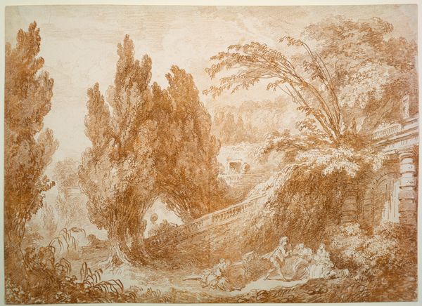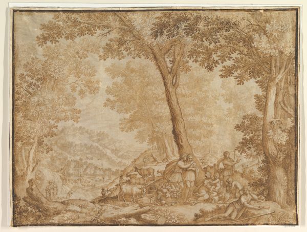 Johannes Glauber created this drawing titled "Landscape with Figures by a Stream" using pen and brown ink. Notice how the composition is structured by stark contrasts between the heavily worked foreground and the lightly sketched background. This contrast enhances the spatial depth, drawing our eyes across the scene. Glauber masterfully employs line work to define forms, from the intricate foliage of the trees to the distant, softly rendered mountains. The foreground is dominated by the presence of robust trees and figures by the water, creating a barrier that invites the viewer to pause before entering the landscape. The texture of the paper also contributes to the artwork's aesthetic, adding a tactile dimension to the visual experience. The strategic use of light and shadow further emphasizes the separation between foreground and background. This creates a sense of narrative and invites a deeper reflection on the interplay between nature and human presence within the landscape.