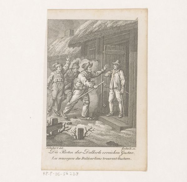 Curator: Georg Christian Schule’s engraving, “Ulykkelige hændelser nr. 1,” created in 1787, presents a darkly satirical take on history painting. The title translates to "Unhappy Events No. 1". Editor: My first thought? It's bleak. Stark contrasts in the engraving create this sense of dread. The figures look quite distressed. There's an ominous tone, but it is quite striking given the sharp lines and the obvious labor that went into its making. Curator: Absolutely. It is believed that Schule made this piece after a fire at Christiansborg Palace, so there is historical grounding to his critique. The piece blends figuration with elements of caricature, likely offering commentary on the socio-political climate in Denmark at the time, though this reading isn't fully substantiated. It would likely point to feelings of insecurity in light of state mismanagement and growing discontent. Editor: The materiality is also striking when you consider the context. Printmaking was often commissioned, so there would be an implicit contract between the patron, the printer, and the engraver in a piece like this. Who, I wonder, was the target consumer, and to what extent might Schule be able to play with the medium of printmaking to convey his socio-political critique? The marks, the time spent on these marks, show intention and thought in a highly reproducible form. Curator: That tension, I believe, gives this piece a subversive edge. It hints at power structures and how they are perceived. Who holds the scythe? Who commands? Are they on equal footing? What statement is made? The piece clearly uses symbolism to comment on these ‘Unhappy Events.’ Editor: Yes! The work shows an important facet of the material life and craft, with which a socio-political landscape of Denmark can be examined. This engraving isn't just a picture; it's evidence of a time, created with great effort, and that shows up clearly in its materiality. Curator: I think it allows us a lens to examine political power as it was experienced and conveyed through social artistic practices. Editor: I agree, reflecting on its construction illuminates its deeper significance within Danish society at the time.