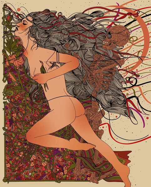 Curator: Cassidy Rae Marietta's intriguing composition, "Everybody Loves the Sunshine," presents a unique juxtaposition of life and death through its layered imagery and line work. What strikes you first about this piece? Editor: The immediate feeling is one of surreal calm. Despite the skeletal figures intertwined with the living form, there's a languid, almost peaceful atmosphere, reinforced by the soft color palette and organic lines. It's unsettling but captivating. Curator: Indeed. Note the dynamic interplay of those very lines: the dense, almost chaotic waves that form the base, contrasted with the smoother, more defined contours of the figures above. Semiotically, these lines evoke growth, decay, perhaps the very cycles of nature itself. Editor: And speaking of those cycles, there's an inescapable erotic undercurrent, a deliberate acknowledgment of the body, alongside the symbolism of mortality. The nudity is not simply aesthetic; it positions the female form within a wider conversation on vulnerability, impermanence, and the persistent male gaze that can extend even to post-mortem considerations. The single flower becomes a loaded symbol. Curator: Precisely! Its placement covering the breasts invites multiple readings of concealment and unveiling. We also cannot ignore the rather dominant geometric red sphere, positioned perfectly centered in the top portion of the work, mimicking, or reflecting on the rainbow patterns lining the left and right sides of the work. Editor: The rainbows juxtaposed against the skeleton become ironic almost; symbols of hope that are in decay? The artwork seems a conversation between the hopeful spirit, yet underlying understanding of morality's undeniable grip on our temporal existence. Curator: The composition as a whole is quite ambitious. It deftly combines figuration and organic forms within a structured frame. Marietta creates a space where these dichotomies not only co-exist, but depend on each other. Editor: Marietta's "Everybody Loves the Sunshine" leaves one contemplating the ever-present shadow that love and sunshine cast. Curator: Yes, a potent reflection on the intertwined nature of existence and mortality rendered through skillful formal devices.