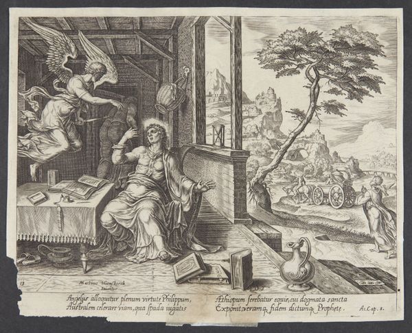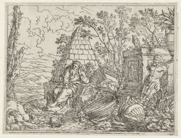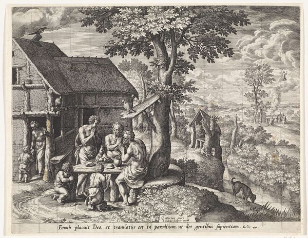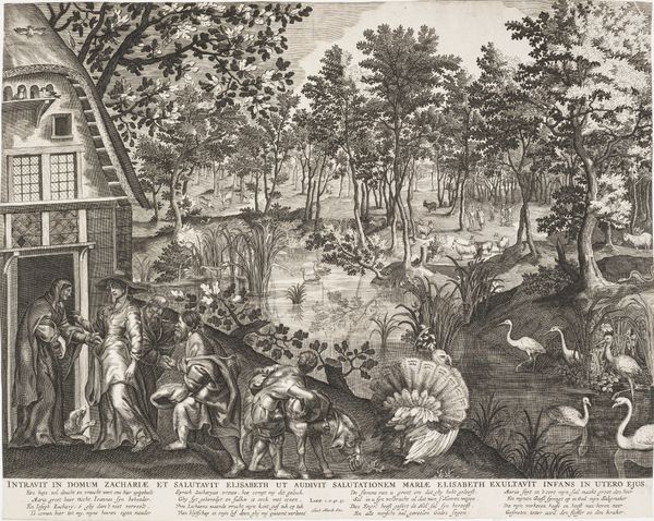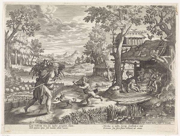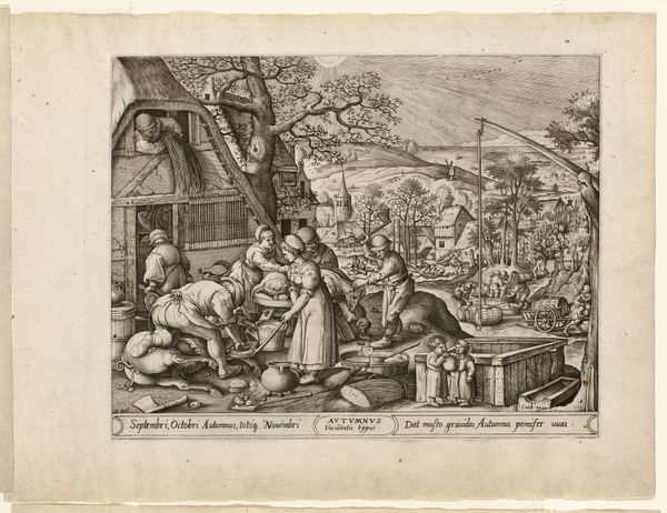 Curator: What a bustling scene. I'm immediately drawn to the textures in the foreground, the roughly hewn wood and dense foliage created from seemingly endless tiny lines. Editor: Indeed, there is quite a bit going on. We are looking at "Landbouw en veeteelt," or "Agriculture and Animal Husbandry," a pen and ink drawing, dating to 1608 by Claes Jansz. Visscher. It's currently held in the Rijksmuseum collection. It really gives one a sense of 17th century rural Dutch life. Curator: The focus on depicting daily labor is so compelling. Note how Visscher uses hatching and cross-hatching, primarily with pen and ink, to model forms and light in an efficient manner that mimics the work being done; repetitive, functional marks build up into a detailed depiction of labor. Editor: Right, and consider the societal implications— the subject matter, celebrating common labor, would be seen as revolutionary at the time. The Golden Age in the Netherlands was, of course, built on agriculture, but was that a suitable subject for "high" art? This piece straddles the lines between a genre scene and something more politically charged. It's such a social document! Curator: Absolutely. Looking closer, one sees that the figures aren't idealized. Their postures speak of real physical exertion. Look at the woman in the lower-right scrubbing what looks like laundry. What's being washed is much less important than *how* the labor is represented: her hands, raw, rough, the strain visible. These aren’t peasants posing for the leisure of noble audiences. The sheer amount of manual work involved simply jumps out. Editor: And there’s a fascinating juxtaposition of labor happening here, between those beating the flax and those doing other types of agricultural activity outdoors. It underscores how central domestic industry was intertwined with agrarian practices. The material outcomes, textiles and produce, become evidence of the society's entire network of dependencies and resource flows. Curator: It’s a surprisingly modern approach, frankly, acknowledging the dignity of labor itself as both a visual subject, a historical touchpoint, and the bedrock upon which culture is based. The artist directs the viewers attention through this complexity by focusing the light in certain key areas and carefully orchestrating movement across the landscape. Editor: Absolutely, and for visitors today, reflecting on an image like this helps us appreciate how artistic representations can shape our understanding and give form to our relationship with broader political forces. Curator: A powerful snapshot of a particular time, represented with incredible artistry using humble materials and drawing techniques. Editor: Yes, a confluence of societal, political, and material histories made wonderfully apparent!