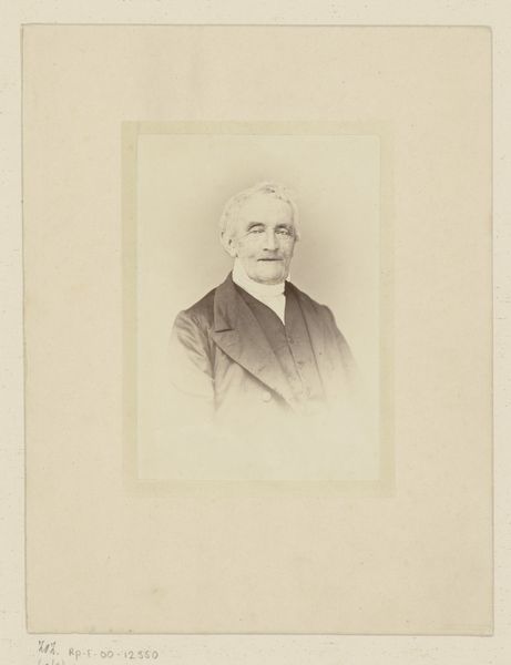 Curator: There's something intensely serene about this portrait. The subject gazes with a quiet wisdom, doesn’t he? Editor: He certainly projects that, and that comes through clearly even despite the photographic processes and conventions in play here. What we’re viewing is a photograph entitled “Portret van een man met baard”—"Portrait of a Man with a Beard"—dating from somewhere between 1850 and 1870. We know the photograph to be the work of Richard Boning. Curator: The paper’s tone really affects how we view it, doesn't it? All that gentle fading... it makes me wonder, what was his life actually like? A man of such calm... Editor: Yes, it’s the very materiality of it, the aged and toned paper as we find it now, that triggers that historical curiosity, doesn't it? Back then, photography was becoming a middle-class status symbol—a new way to document oneself for posterity. How were such images viewed at the time versus now? What did it mean to display or keep an image such as this? Curator: Exactly! I see something archetypal about him too—the wise elder. That long beard functions almost as a symbol itself, representing experience and a certain dignified gravitas. It adds layers of meaning. Editor: Indeed. We must remember that even portraits designed for the average person are shaped and mediated by various forces. Studio practices, societal expectations around posing and attire all played their roles. Photography might seem like an objective mirror, but even here in a piece of realistic presentation, we see layers of choices, of visual culture at work. Curator: The fact that he agreed to be depicted in this way is a conscious decision and this realism that we now know from photography was in that time still pretty recent and new to people, so there has been though to it, not just for him as the portrayed subject but for the artist also. I find that intriguing to see so much character portrayed. I keep looking to see what other stories are written on his face, perhaps. Editor: Well said. And through these subtle visual cues and material contexts, a humble portrait expands into a study of shifting social values and personal ambition—reflected both in his time and ours. Curator: Perhaps, art invites us into just these kinds of ongoing conversations, and what more for an object from so long ago? Editor: Precisely, providing a way to understand what values remain but also those that changed so radically!