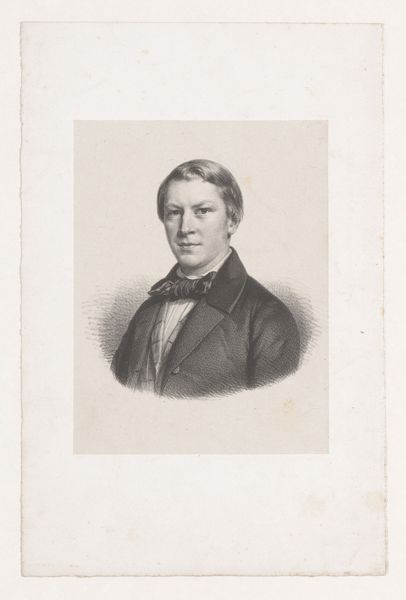 Editor: Here we have a portrait from the Rijksmuseum, titled "Portret van een onbekende man, mogelijk J.C. Hummel," potentially from 1847, by Johann Peter Berghaus, executed as an engraving. There’s a remarkable stillness in the sitter’s pose; how do you interpret the visual elements within this work? Curator: Formally speaking, the success of this engraving hinges on Berghaus' masterful manipulation of line and value. Notice the meticulous rendering of the sitter's garments – the subtle gradations of tone which suggest texture and depth are particularly compelling. Consider, too, the geometric composition: the sitter's body creates a pyramidal form, lending stability to the portrait. What does the symmetry, or asymmetry, of the lines convey to you? Editor: I see the symmetry, especially in his face and jacket, but also note how the lighting isn't perfectly even. One side of his face is more shaded, and his hand almost disappears into the background. Curator: Precisely. That interplay between light and shadow creates a subtle tension, doesn’t it? It's this nuanced application of chiaroscuro that prevents the work from becoming merely representational, elevating it instead to an essay on form and light itself. The expressiveness derives not from narrative but from form. Editor: That’s interesting, I hadn't thought about it that way, focusing on the form and light rather than the identity of the sitter. It shifts my perspective quite a bit. Curator: It is a dance of technique and execution, and perhaps that’s the true subject here. The sitter almost becomes incidental, subordinate to Berghaus' exploration of line and shadow, don’t you think? Editor: Yes, I do. I am struck by the formal aspects of the artwork. I learned to analyze portraits based on composition alone. Curator: Excellent.