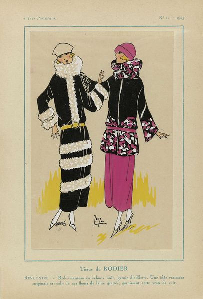 Editor: Here we have a print titled "Trés Parisien, 1923, No 5: Journée des Drags..." made in 1923, currently residing in the Rijksmuseum. It's rendered in ink and watercolor on paper and strikes me as very much a sign of its era. The color palette, the poses... it all feels very ‘roaring twenties.’ What do you see in it? Curator: You know, looking at this, I'm instantly transported back to jazz-age Paris. It's more than just fashion; it’s an echo of societal shifts, women embracing freedom and modernity. Notice how the artist emphasizes the linear forms, and flattened perspective --very much in the Art Nouveau vein, wouldn’t you say? There's almost a theatricality about it, with those bold outfits. Imagine these women gliding through a smoky salon. Don't you get a sense of performance and daring? Editor: Absolutely! The outfits really pop – especially the dress on the right. All that lacy fabric – lovely. Curator: It’s a celebration of the chic. The clothing almost becomes architecture, doesn’t it? But beneath that veneer, there's this current of the ephemeral - fashions fade, eras shift. And yet, captured in ink and watercolor, here we are still looking! What would these fabulous people think, do you imagine? Editor: Maybe they would be surprised to see their 'now' is now the 'past'. Curator: Perhaps, but I also suspect they'd recognize that hunger for beauty. Editor: Definitely gives you something to ponder. Thanks for the perspective.