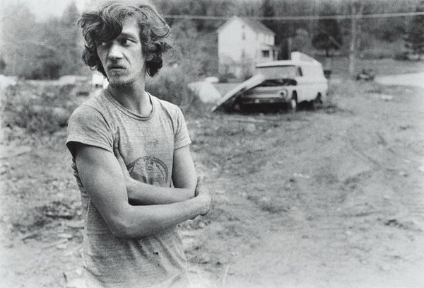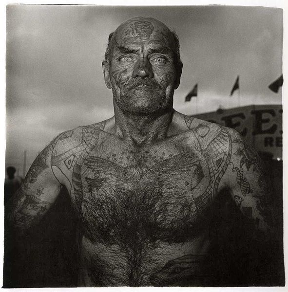 Editor: This is Eva Rubinstein's "Portrait of Tattooed Man" from the 1970s, a black and white photograph. It's striking how raw and direct the subject is. What can you tell me about this work? Curator: This piece brings up interesting questions about representation and labor. The tattoos, the clothing, the direct gaze – these are all material signifiers that point to a specific social and economic context. Where and how do you imagine the image was created, given the man’s tattoos, clothes, and what appears to be a dilapidated structure in the background? Editor: It looks like an outdoor setting, maybe rural? His tattoos seem… amateur, like they might have been done by hand, perhaps even by himself or a friend? Curator: Exactly! The "handmade" quality of the tattoos versus what we might think of as today’s slick tattoo culture immediately raises questions about access, class, and even skill as a commodity. Rubinstein has framed this person and this scene with precision using readily available, relatively affordable film, ink and a means of developing the images, hasn’t she? Do you see how the artistic choices – the stark black and white, the unadorned background, the subject’s unidealized body – avoid romanticizing the subject and instead encourage us to consider the material conditions of his life? Editor: That's fascinating. It really makes you think about the process of making the image as well. I was initially just drawn to the composition, but now I'm seeing how all those material details contribute to a larger statement about society. Curator: Precisely. We see how seemingly simple artistic decisions reflect the complex interplay of social forces. The value then lies in understanding those relationships between making art, representing individuals, and impacting our understanding of our social and economic structures. Editor: This was so insightful, I appreciate you guiding my thinking toward production and larger cultural questions.