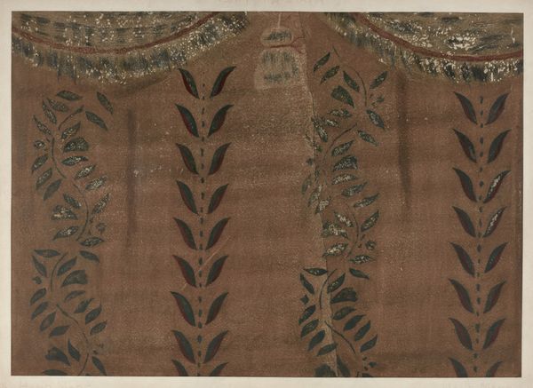 This anonymous book cover presents two borders adorned with delicate floral patterns on a paper sheet. The composition is structured by alternating vertical stripes of floral garlands and lines of small circles, creating a rhythmic visual experience. The subdued palette of pinkish-brown and green evokes a sense of natural harmony and balance. The repeating patterns suggest a systematized approach to design, but the slight variations within the floral motifs introduce an element of organic imperfection, disrupting any rigid interpretation. This interplay between order and disorder challenges the viewer to reconsider fixed categories of design. The artist uses a semiotic system of floral signs, which may reflect broader cultural codes related to nature, beauty, and perhaps, the fragility of life. These decorative elements become part of a dialogue that probes the boundaries between art, utility, and cultural representation.