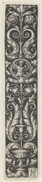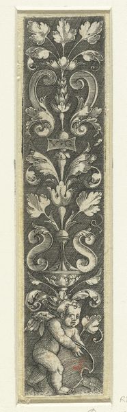 Curator: Isaac Walraven's "Bladranken in ovaal," dating roughly between 1696 and 1765, is an exquisite example of Baroque engraving. The artist masterfully uses line and form to create a geometric shape, filled with decorative leaf motifs. Editor: It immediately strikes me as very balanced, almost meditative. The dark ink against the pale paper creates a satisfying contrast and a contained, comforting visual space. It is as if nature is being framed and perfectly controlled. Curator: Yes, the composition adheres to a clear symmetry. If we analyze the structural layout, we can see how each curved line mirrors another, thus creating a very strong central axis. What this achieves is visual harmony. Editor: It also triggers something very familiar. The arrangement of these curling leaves and abstract floral forms around a central 'bud' recalls ancient symbolic traditions around the cycle of life and growth; a mandala effect, or even the "Seed of Life" pattern echoed across cultures. Curator: The oval shape, contained within a rectangle of untouched space, enhances the notion of containment and precision. The stark use of black ink also lends the print a decisive graphical feel that reinforces this sensation. Editor: For me, the appeal comes from recognizing symbols—almost primordial in their essence— of continuous generation. Each curl and leaf subtly nudges memories of renewal and growth we collectively feel. Curator: True, and even on the textural level, the etched lines themselves display this cyclical growth you discuss. They swell and diminish slightly, hinting towards internal rhythms as if they live and breathe within the oval. Editor: Ultimately, I find myself reflecting upon art's perennial effort to grasp at—and portray—the very pulse of nature and existence through recognizable iconography. Curator: Indeed. It’s quite remarkable how, through carefully constructed lines and composition, Walraven has rendered what seems both simple and fundamentally complex.