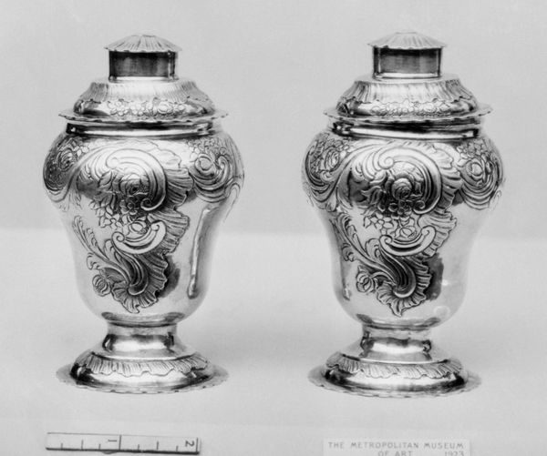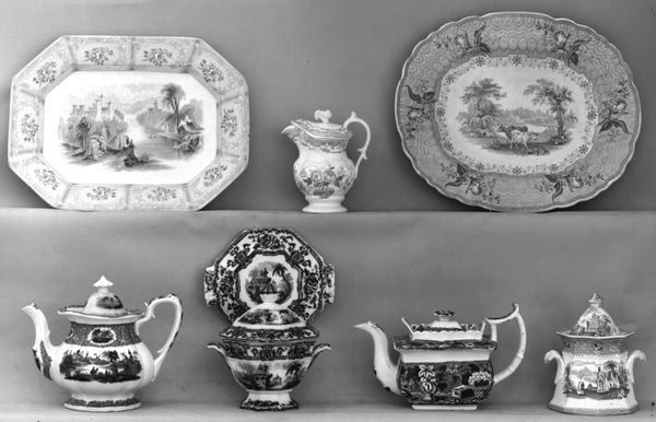 Curator: I’m struck by the incredible density of detail, almost claustrophobic, and rendered entirely in monochrome, despite its decorative qualities. It looks remarkably energetic and crammed. Editor: Today, we’re looking at a "Pair of Bottle Vases" and a single jug attributed to Samson and Company, crafted sometime in the 19th century. They are now part of the collection here at the Metropolitan Museum of Art. All ceramic, each piece has intricate ornamentation. Curator: It's hard to ignore the Eastern influences at play here. Floral patterns, long-tailed birds that hint at peacocks, and perhaps, phoenixes - they evoke an almost mythical, exotic past. Do you agree that these images function as windows to different cultural associations? Editor: Absolutely. The very act of emulation, of appropriating motifs from the East and transmuting them through a European lens, is telling. The method by which the artisans at Samson and Company sought to reproduce something authentic speaks volumes about 19th-century markets, desires, and class values. We’re essentially observing industrial production meet “exoticism,” for the growing middle classes. Curator: Considering it, what about the more hidden symbolisms, though? Flowers signify growth, vitality; birds symbolize freedom, ascension, even immortality. Woven together, they seem to project the dream of transformation and transcendence to me, packaged for the domestic space. Editor: I concede they certainly have visual power. However, it's the factory-like production methods, the means by which such objects were created, distributed, and ultimately consumed that pique my interest most. I am left asking questions about authenticity in mass reproduction... Curator: All compelling observations! It encourages viewers to consider what symbols and images they bring to their experiences of the artworks before them. Editor: Indeed, while pondering the complex web of craft, history, and industrial methods in production of artwork.