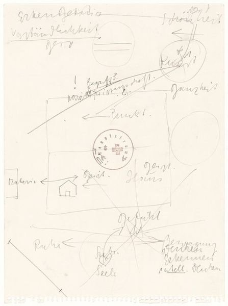 Editor: This is Stuart Davis's "Color Circle Diagram." It's undated, but it's a pencil sketch showing color relationships. It feels like a very pragmatic exercise, but what else do you see in it? Curator: I see Davis grappling with color not just as a visual element but as a system deeply embedded in social and political meaning. How do we reconcile the scientific approach here with color's inherently subjective and cultural role? Consider how certain colors are historically gendered or associated with specific political movements. Editor: So, beyond just being a study, it's an exploration of how we perceive and understand the world through color? Curator: Exactly. It encourages us to question how systems of organization, like color wheels, reinforce or challenge existing power structures and ingrained biases. Editor: I hadn’t considered how even something as seemingly objective as a color wheel can be culturally loaded. Curator: Precisely. And that awareness is the first step to dismantling those biases.