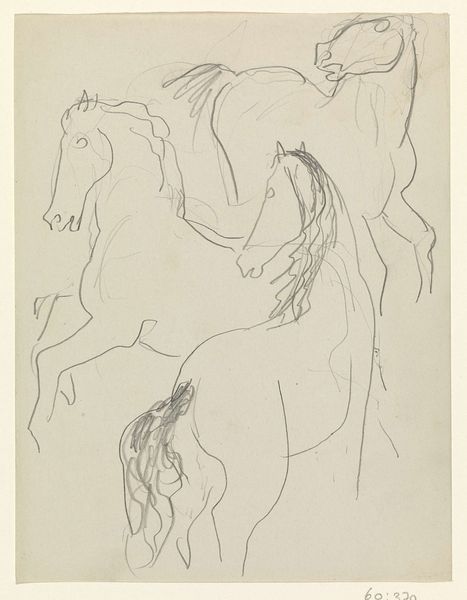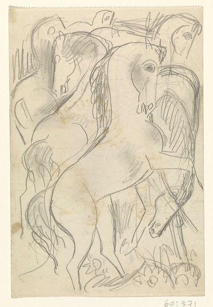 Editor: So this print, called "Horses," is a 1954 work by Jean Clerte. It's strikingly minimal, just outlines of horses. There's almost something Cubist about it. What’s your interpretation? Curator: It’s interesting that you mention Cubism. The lines, the way they almost dissect the forms of the horses, definitely resonates with that early 20th-century impulse to break down and reassemble reality. Consider the postwar context of 1954. What role might images of powerful animals like horses play? Editor: I hadn't really considered that aspect. Perhaps there's a connection to the rebuilding period after the war. Could these horses represent strength, vitality, a return to normalcy? Curator: Exactly! Think about the long history of the horse as a symbol of power, both economic and military. Clerte may have been subtly engaging with these connotations at a time when France, and Europe in general, was grappling with its identity and place in the world. Do you think the seemingly incomplete quality of the sketch adds to the artwork? Editor: Definitely! It adds a layer of vulnerability. Like the image of strength is fragile. It's just a sketch, the artist isn't claiming they are completely put back together again yet. Curator: Precisely. It challenges the traditional heroic image and suggests something more nuanced. It's important to note, too, that Clerte was working in a time when the accessibility and the value of the “sketch” was being redefined. Editor: It’s amazing how much context shifts the way you view a work like this. Curator: It truly does. And seeing how socio-political context changed this image over time is important for museums to portray properly. Editor: This conversation has totally changed how I perceive the role of symbolism within art as a mirror of historical happenings.