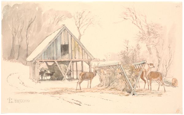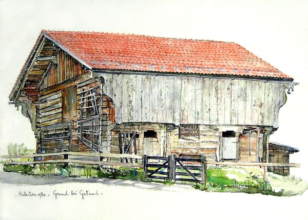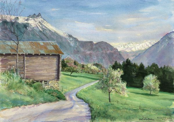 Curator: So, before us, we have Hubertine Heijermans' watercolor painting, "Mountain barn at 'Les Posses' above Gryon," created in 2003. It seems to reflect the styles of plein-air and post-impressionism. Editor: It evokes such a calm, rural scene. The colours are quite muted and I feel this slight touch of melancholy. Curator: Indeed. The barn dominates the center. Looking into its context, rural life in early 21st-century Switzerland existed as a nostalgic mirror to contemporary society, and became a form of pastoral escape. I can also say this type of setting may have had personal ties to Heijermans. Editor: Right, the work is deeply rooted in the picturesque – but who does that appeal to and why? Who are these images meant for? In light of modern farming practices that drastically affect landscape, does the romanticism it seems to encourage have consequences? Curator: Interesting point. Certainly, a critical gaze is warranted when dealing with depictions of rural life. Heijermans’ work emerged in a time where the reality of agrarian culture became increasingly precarious due to modernization. Editor: Precisely, so how much does it reflect what's actually there and who exactly is it meant to serve? There is definitely an emotional impact here, but there should also be an understanding of the social undercurrents at work. Even as just a watercolor sketch. Curator: I concur; her emphasis on capturing this specific barn speaks volumes about the contemporary longing for simpler times. The materiality itself - watercolor - adds another layer to this romantic notion. A fast way to make an emotional landscape painting as an observation, almost a note, or a study. Editor: Maybe this is why it has such a strong sense of being, yes, simple. Though, while it leans towards sentimentality, examining the setting within larger narratives and thinking critically is essential, specifically within the context of labor and class. Curator: Absolutely, that is critical thinking that allows the observer to reflect upon the historical, cultural, and socio-political undertones influencing the image. And, again, maybe why these types of imagery prevail even today. Editor: Which makes art viewing far from a passive experience.