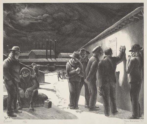 Curator: Let’s discuss Florence Bateson's woodcut print, *Untitled (Snow Shovellers)*, from 1936. What are your first thoughts? Editor: Immediately, I’m drawn to the graphic quality – the sharp contrast between light and dark really emphasizes the physical labor, the repetitive action of shoveling, almost a dance of necessity in the urban landscape. You feel the chill. Curator: Yes, and that starkness speaks to a particular time. Look at how the snow isn't idealized; it’s heavy, dirty, compacted. The artist does well showing dignity, but also how people work under harsh urban environments, especially with it dating to the 1930s. The stoicism on the figures resonates within a very socially aware image, an attempt to show the hardship of a populace affected by the depression and severe winters. The bent backs… Editor: Precisely! It’s more than just documentation. I mean, think about the material reality of creating this image: Bateson is meticulously carving away at a block of wood to create these precise lines, mirroring the very physical work depicted in the print. And this kind of printmaking democratized the production of art – a means of sharing images more widely during times when resources are thin. Curator: That’s very insightful, the democratization is true! You know, for me, beyond the process, I’m fascinated by the composition choices, those bare branches almost seem to echo the men bent over, suggesting that there's always hardship but also survival and a connection to the cyclical return, despite all obstacles, that life is there. The building looming in the background does that too; its size overwhelms and the barred windows, with snow stuck in them, symbolize to me confinement, restriction to one's possibilities, but the snow shovelers seem like silent heroes, keeping everyone alive. Editor: I agree, these men are central to the urban process and progress. You mention survival: printmaking like this has long survival times too; inexpensive production ensures that people can experience art and labor that art portrays simultaneously. Curator: We find connections between production and artistic choices often – these choices echo across history and cultures, revealing complex stories within their forms. Editor: Indeed!