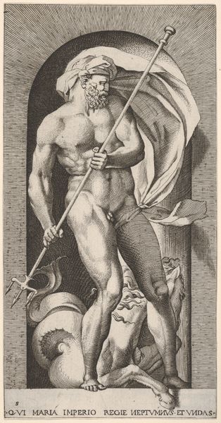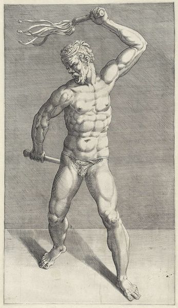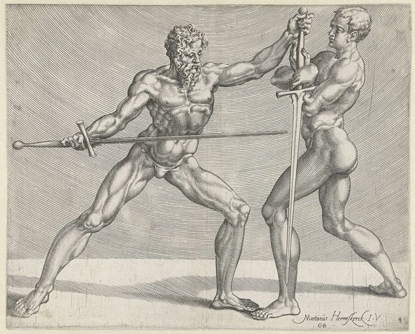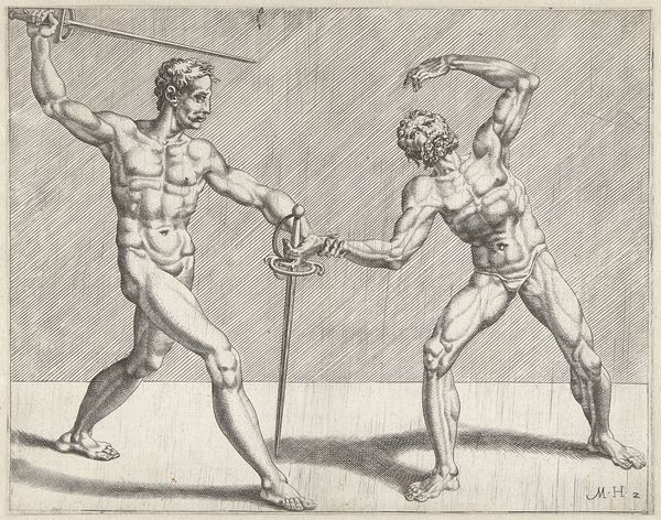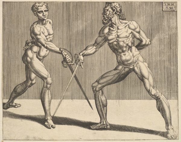 Cornelis Bos made this engraving, "Two Swordsmen," in the Netherlands, sometime in the first half of the 16th century. The print depicts two nude men locked in combat, each brandishing a sword. Their muscular bodies and dramatic poses recall classical sculpture, a key influence on Renaissance art, particularly in its fascination with the male nude and the celebration of physical prowess. However, the image also participates in a broader social and cultural context. During the 16th century, the Netherlands was undergoing significant religious and political upheaval, ultimately leading to the Dutch Revolt against Spanish rule. The violent struggle depicted could be interpreted as an allegory for this conflict, with the swordsmen representing the forces of resistance and oppression. Prints like this were often used as propaganda, to rally support for a cause or to demonize an enemy. To understand this image more fully, we can look into the history of printmaking in the Netherlands, the political climate of the time, and the artist's own background and beliefs.