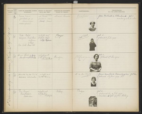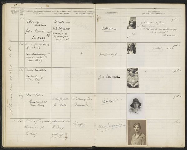 Curator: This page from the Stamboek van de leerlingen der Koloniale School voor Meisjes en Vrouwen te 's-Gravenhage deel I, likely from 1929, presents a fascinating composite of handwritten entries, photographic portraits, and bureaucratic record-keeping on paper. It really speaks to a particular historical context. What strikes you initially about it? Editor: It's fascinating to see these portraits embedded within what is essentially a ledger. It’s like a collection of tiny studio photographs repurposed into an institutional document. What do you see as the significance of the materials used in constructing this page? Curator: I'm immediately drawn to the juxtaposition of the standardized format—the printed lines, the regimented columns—with the handwritten script and individually posed photographs. The materials tell a story of early 20th-century Dutch colonial education, where individuality, captured in these personal photographs, is simultaneously framed and contained by institutional power. How does the materiality of this piece – the paper, the photographic prints – influence your interpretation? Editor: It almost seems like the school is trying to standardize what is ultimately a very human experience. Curator: Precisely. Think about the labor involved – the paper manufacturing, the photography, the administrative work. These were all processes often outsourced, maybe even relying on colonial networks. The contrast creates a visual tension, don't you think? Editor: It does. It makes me wonder about the accessibility of photography at the time, and who had the privilege of having their portrait taken. Curator: Exactly. It provokes us to question not just *what* is depicted but *how* and *why*. I've been pondering whether that tension reveals underlying power dynamics within the colonial education system itself. Editor: I hadn't considered that, but viewing the piece through the lens of labor and production definitely offers a new understanding of it. Curator: Indeed. And looking closely reminds us that even seemingly mundane documents can reveal complex narratives about individuals, institutions, and the broader material conditions of their time.