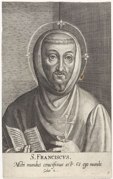 Editor: So, this is “H. Dominikus,” an engraving made sometime between 1579 and 1615 by Dominicus Custos. It's quite striking. The details are so precise! The split background, the soft light of the halo. What do you see when you look at this piece? Curator: This print offers an intriguing glimpse into the visual strategies used to construct historical and religious figures. Consider the power dynamics inherent in commissioning such a portrait. How does Custos employ established visual codes of holiness? Editor: He definitely ticks the boxes: halo, lilies... but what about that very stern look on his face? Curator: Exactly! How do those markers intersect with broader cultural expectations? Note the inscription, too. These textual and visual cues worked in concert to create and reinforce specific narratives around sainthood. Do you think this engraving was intended for private devotion or public display? Editor: Hmm, perhaps a little of both? The details feel intimate, yet the inscription seems intended for a wider audience. It’s almost like a promotional tool for the Church. Curator: Precisely. And considering the rise of print culture at this time, the role of dissemination becomes crucial. Engravings like this served as vital instruments for circulating specific representations. How did these images influence understandings of holiness or challenge existing ones? Editor: I never thought about it that way – like a controlled branding exercise for saints. It makes you wonder about the agendas behind these images. Curator: It does. Thinking about the socio-political context, the distribution networks, and intended audiences really open up this image to new levels of understanding. Editor: Definitely! It highlights the complex relationship between art, power, and religious belief in this era. Thanks for sharing this perspective.