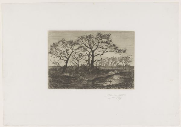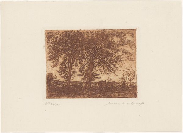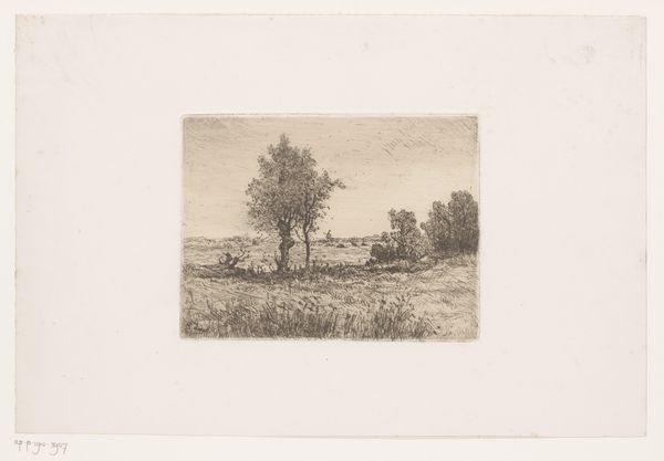 Curator: Ah, this landscape whispers stories of quiet rural life. It’s “Landschap met boerderijen achter een grote boom”—Landscape with farms behind a big tree—an etching and drypoint print rendered in ink by Louis Adolphe Jacobs. The Rijksmuseum dates it to sometime between 1865 and 1910. Editor: It has a wonderfully somber, reflective mood to it. All these dark tones make me think of rainy days. A stillness... Did he capture what the landscape really *looked* like, or how it *felt*? Curator: The late 19th century was a fascinating time for landscape art. You had the Realist movement gaining momentum, aiming to depict subjects objectively, as they appeared in life. It's a move away from idealized landscapes, you know? Instead, Jacobs presents the common scenery. There's nothing picturesque per se. Editor: But those intricate branches reaching across the frame—they're practically dancing. Even the scratchy lines making up the field seem to vibrate. Curator: Jacobs really utilized the etching technique here to convey a rich sense of texture. The tree almost dominates the view, doesn’t it? I believe it provides us with the perspective on social change. Agriculture transforms the land to grow. It emphasizes people's dependence on nature for survival, even as agricultural industrialization progresses. Editor: I get that. He's reminding us of nature's power in a quiet way, almost protective of the little homes huddled behind. Almost hiding, perhaps, or sheltering the human settlement from… something? Curator: What are you reading into this idyllic scene? Editor: Well, art should leave you with more questions than answers. Jacobs has captured a time of change. I love how this work, seemingly so simple, becomes more intricate and layered the longer you look. Curator: Precisely. That speaks to his talent, I believe, his insight into presenting nature and agricultural spaces as complex forces in everyday lives. Editor: It’s a beautiful piece for its mood and also historical context, especially here at the Rijksmuseum. It makes one really appreciate art from then 'til now!