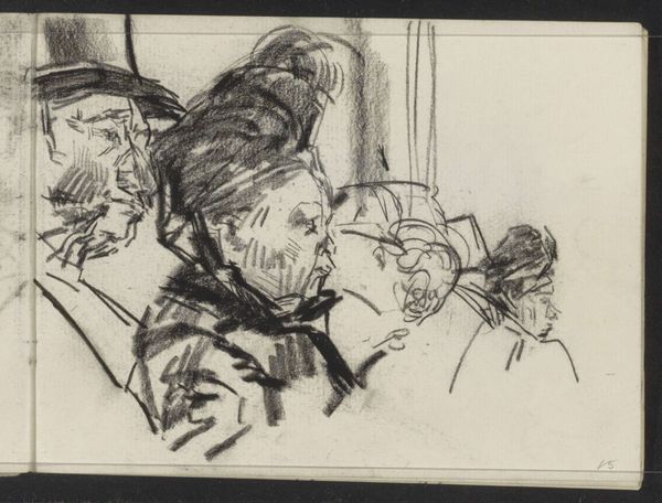 Editor: Here we have Jean-Louis Forain’s "Scene of a Hearing (The Two Lawyers)," a drawing with no specific date. The frantic energy of the lines really strikes me. What do you see in this piece in relation to the art world at the time it was created? Curator: Forain captured the Belle Époque's underbelly, often depicting legal settings to critique bourgeois society. His rapid strokes expose the justice system's performative aspect and its effect on public perception. The sketchy quality reflects the changing role of art in society. Editor: So, the unfinished quality is deliberate, to show the instability and the role of the artist. Curator: Precisely! It moves away from academic polish toward a more immediate, critical commentary. The artwork functions almost like a political cartoon, offering social commentary. Editor: I see it now. The drawing's lack of completion speaks volumes about the artist's intent and the socio-political issues he wanted to highlight. Curator: Exactly, it leaves you with a lot to consider.