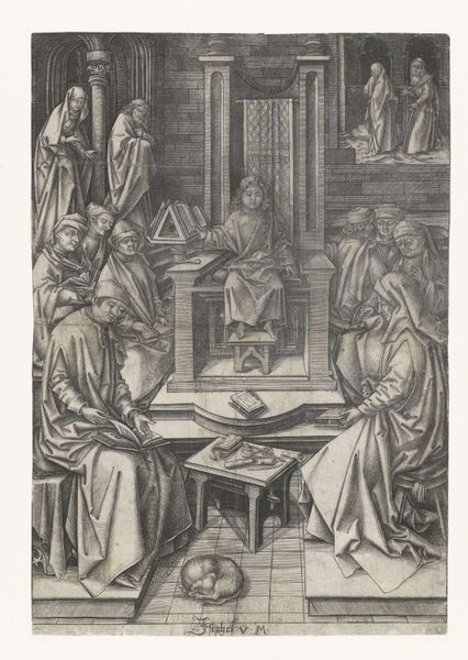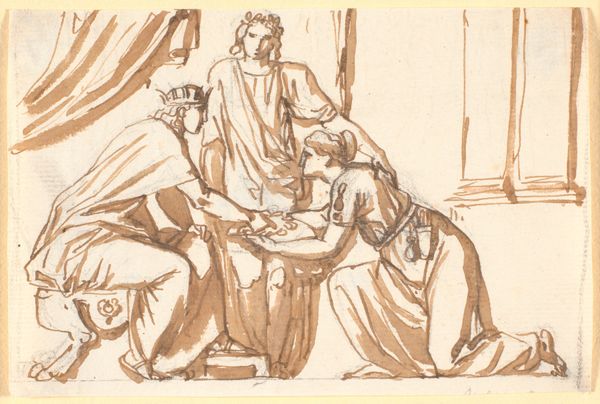 Editor: This is Martinus Rørbye’s pencil drawing, "Christ and the Two Disciples at Emmaus," from 1842, housed at the SMK. It’s a study, really – so immediate and intimate. I'm curious about how he uses light and space, particularly the somewhat spectral depiction of Christ. What do you see in this piece, beyond the biblical narrative? Curator: This drawing allows us to consider the role of religious imagery in 19th-century Danish art. While ostensibly illustrating a biblical scene, Rørbye's work also participates in a broader discourse about national identity and moral values. The revival of religious themes occurred alongside a growing interest in folklore and history. Note the emphasis on domestic space; how might the intimacy of the setting relate to contemporary understandings of piety and nationhood? Editor: So, you are saying this isn’t just a Bible scene? I guess I had assumed the subject matter was just religious. Curator: Exactly. Artists frequently use established narratives to express current cultural or political ideals. Consider how Rørbye uses simple, accessible forms – the humble meal, the shared space – to potentially create a sense of shared national and spiritual purpose amongst viewers. Think about who was commissioning and viewing art like this; How would their social and economic positions influence its interpretation? Editor: That is really interesting. Seeing it in relation to how the public might perceive it adds another layer that I had not previously considered. Curator: And what have you learned that may inform your reading of similar artworks in the future? Editor: Looking for a narrative beyond the obvious to explore what political or cultural commentary might be hidden there. This definitely reframes how I think about history paintings going forward.