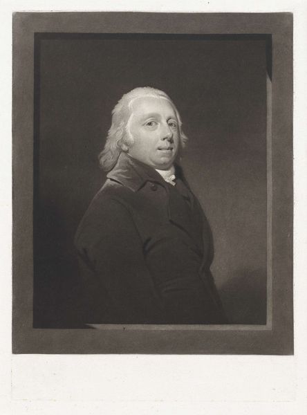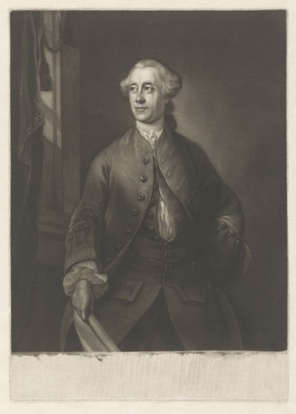 Curator: Ah, the weight of history on a face. Robert Dunkarton's portrait of Richard, Earl Howe, captures him, really. Editor: He certainly looks severe. All that gold braid, the stern gaze... It's a portrait of power, but also of a system built on exploitation and inequality. Curator: Absolutely, and the way Dunkarton uses mezzotint to create such depth and shadow is remarkable. It gives him a ghostly quality. Editor: The darkness almost swallows him, doesn't it? Like the shadows of his legacy are catching up. Howe was a key figure in the American Revolutionary War, remember. Curator: Right, that uniform isn't just fashion. It represents naval might, colonial control. Yet, the portrait feels almost... vulnerable? Editor: Perhaps it's the inescapable gaze. We're forced to confront not just Howe, but what he represents. Curator: Makes you wonder about the unseen costs of power, doesn't it? Editor: Indeed. And the silences history often obscures.