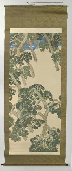 Curator: Immediately striking! The poppy seems to drip onto the muted background. It has a fascinating, somewhat melancholic quality. Editor: That's interesting. What you're viewing is Carel Adolph Lion Cachet's watercolor design created around 1925, entitled “Design with Poppies for the Edge of the Tapestry View of Florence,” which resides here at the Rijksmuseum. As the name suggests, it was intended for a tapestry border, explaining its narrow, vertical format. Curator: I can see that now, intended as part of something grander. The rendering of the poppy itself feels quite modern though. Almost abstract in its looseness, compared to the art nouveau styling of the stems. I like how the watercolor bleeds. It gives it an ephemeral feel, like a fleeting moment in nature. Editor: The organic theme connects deeply with the Art Nouveau style, visible not only in the subject matter but also in the fluid, curvilinear lines that define the stems. These forms, popular during the era, frequently signified growth, vitality, and the inherent beauty of the natural world. Yet, what I find curious, is Lion Cachet using watercolor instead of dyes to explore pattern and decoration, given the textile applications. Curator: Possibly experimenting, testing the design's impact. And perhaps the blurring aids the sense of depth, creating visual layers with the darker silhouettes in the background. Although initially purposed for mass reproduction via tapestry, the current watercolor form brings this particular piece into sharp focus as one driven more by impressionistic sentimentality rather than strictly commercial imperatives. Editor: I see your point. It speaks to the complexities inherent in artistic production. The poppies also carry diverse cultural meanings. Associated with sleep and death because of their opium content, but also remembrance as they famously bloomed in Flanders Fields in World War I. How might this context affect its interpretation as part of a View of Florence? Curator: Perhaps hinting at the ephemerality of beauty, even within enduring cities. Makes the viewer think about nature’s consistent growth regardless of our presence, right? The design does possess a quiet contemplation that feels removed from commercialism; it presents nature and a subtle sociopolitical stance. Editor: A really interesting duality we can pull from just a border! Thank you, this was illuminating. Curator: The pleasure was mine, offering me an alternate perspective.
