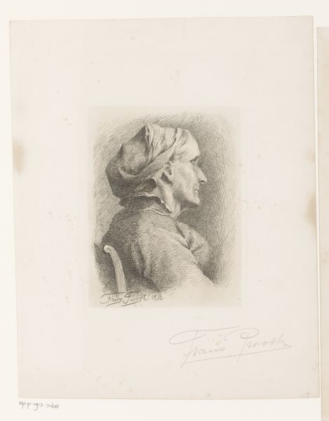 Curator: There’s an almost ghostly serenity about this engraving. It whispers rather than shouts, doesn’t it? Editor: It certainly has a quiet dignity. What we have here is a 19th-century print by R. Bimbi, titled “Portret van schilder Vincenzio Chialli.” As the title suggests, it’s a portrait of the painter Vincenzio Chialli. It seems to be based on an earlier drawing. Curator: The symbolic weight in a piece like this lies in the fact that it is not merely a portrait but a record—an image reproduced, disseminating an idea of the artist himself. He’s rendered as almost a classical bust, eternally preserved through print. Editor: Exactly. It speaks to the social role of art, and specifically portraiture, in immortalizing figures within the art world. Consider the context – 19th-century Italy was in the thrall of a burgeoning sense of nationalism, attempting to codify and enshrine its cultural heritage. Disseminating his portrait through an engraving suggests Chialli held cultural significance, worthy of broad distribution and admiration. Curator: Look closely at how he’s presented. That simple hat could signify him as a free thinker, outside rigid academies, devoted to a life of painting. The subtle details around his face emphasize his gaze. Editor: That's interesting. His gaze isn't direct; he looks off to the side. The decision to capture him in profile emphasizes a more formal, stately air, aligning him within a tradition of portraiture that celebrated accomplishment. Even the careful, neat line work is worth appreciating; it’s technically proficient. Curator: I notice that the cross worn close to the heart invites further inspection; it reflects perhaps a dedication to values that guided his craft. He's more than just an artist, it signals the character behind the canvas. Editor: It highlights how closely intertwined artistic, social and religious spheres could be at that time, impacting patronage, subject matter, and how an artist wished to be seen by the public. Thank you for drawing my attention to the piece's psychological aspect! I am often trapped thinking about macro social contexts. Curator: It's the subtle interplay of symbolism that always intrigues me. Images hold these historical echoes that are easily ignored, if only focusing on the political. Editor: Agreed! This piece reminds us of how prints played a crucial role in shaping an artist's image.
