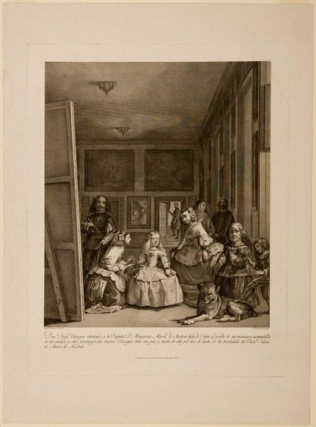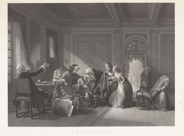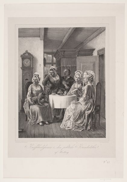 Curator: This engraving, "The Family Concert," was created by Johann Georg Wille, an 18th-century artist known for his meticulous detail. Editor: Immediately, I feel this hushed anticipation, like the moment right before the music swells. The light, the faces...it's so intimate. Curator: That intimacy comes through Wille's technique. He created this print from a copper plate, and the precision allows us to see every fold of fabric, every facial expression, placing us right in the room. Editor: Absolutely. It's like catching a glimpse into a private world, a family bound together through music, history, maybe even obligation. Curator: The image tells us about the social importance of music in the 18th century. It was a common activity for the elite. This was also designed as a tribute to King Christian III. Editor: Fascinating how this one snapshot speaks volumes about the culture of that time. Curator: Exactly, and for me, it highlights the power of art to connect us across centuries. Editor: For me, it is a soft memory of a domestic space that perhaps I did not have.