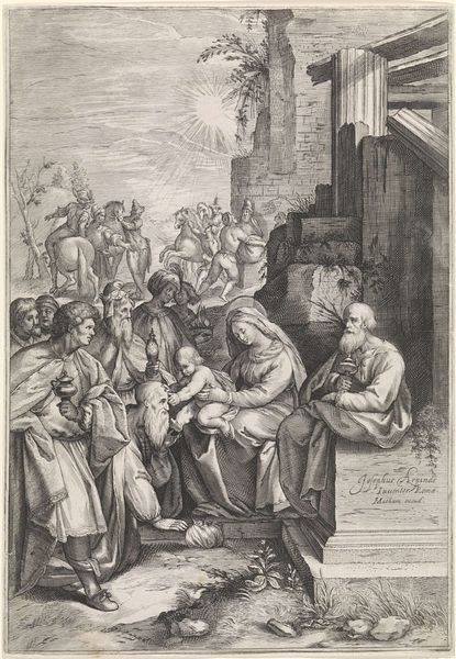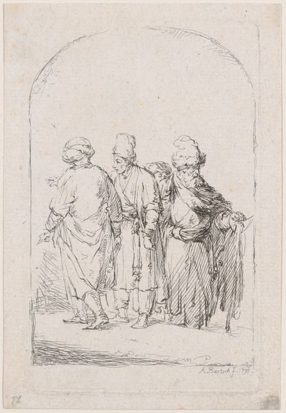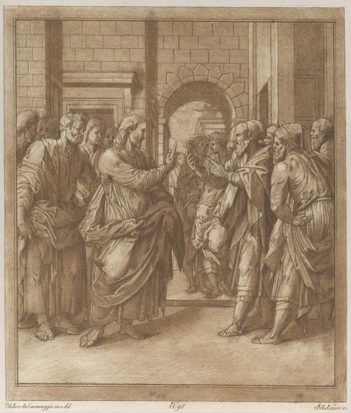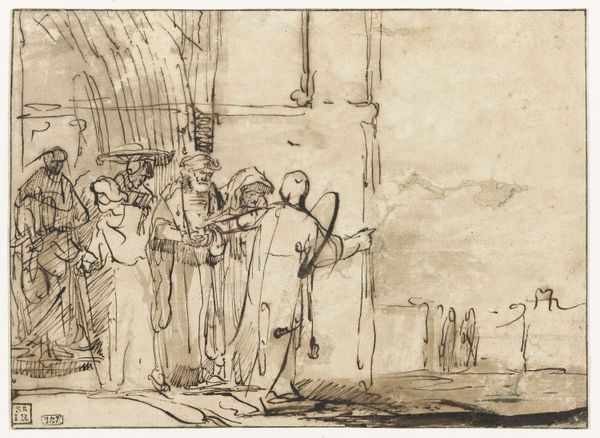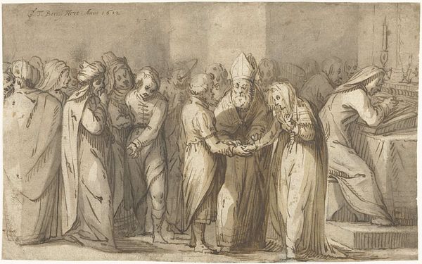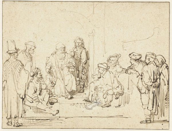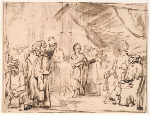 Editor: We’re looking at Nicolas Poussin’s "Study for the Ordination of the Apostles," created between 1642 and 1644. It's an ink drawing on paper, and there's something quite immediate about it. It feels like we're seeing a very private moment of artistic exploration. What jumps out at you when you look at this? Curator: Well, considering Poussin's status as a prominent artist of his time, especially within the French academy and court circles, this sketch provides a fascinating glimpse behind the scenes. This type of history painting served the socio-political function of reinforcing religious authority. But in its preparation, there were alternative avenues for artists. I wonder how Poussin thought about his role, and how the medium here—this pen-and-ink study—enabled exploration away from the public gaze. Editor: That’s interesting! So, it’s not just about the religious narrative, but about Poussin navigating his role in society? Curator: Precisely. Consider also the art market: drawings weren't always valued the same way paintings were. This allowed for less formal, less controlled experimentation. Was Poussin thinking about patronage, or about satisfying his own artistic curiosities here? These sketches often reveal artists’ true styles, not their public faces. Editor: So it becomes almost like a window into his artistic process. What did the act of drawing enable him to explore that the finished painting might not? Curator: Speed and flexibility, certainly. Drawing allowed Poussin to rapidly iterate on compositions, figure arrangements, and emotional expressions. I'd say it shows art-making less as declaration and more as negotiation of ideas between the artist and his material. Editor: That's a perspective I hadn't considered before! Seeing it as a negotiation rather than a statement completely reframes my understanding. Curator: It underscores the importance of looking at art's institutional history and reception – what social roles was it meant to play, and who controlled those roles? And how artists could push the boundaries of such controls! Editor: Thanks for the insight; I will not see such works in the same way now.