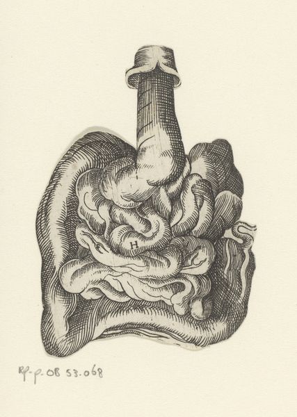 Lucas Kilian made this print, ‘Slokdarm en maag’ – that’s ‘Esophagus and Stomach’ – sometime between 1594 and 1637, using an engraving technique. The image has been incised into a copper plate, allowing for the fine detail we see here. It shows the stomach and esophagus with remarkable precision. Look closely, and you can see the network of blood vessels intricately rendered. The lines vary in weight and density, creating a subtle sense of volume. The skill involved is considerable. Engraving is a slow, deliberate process, requiring immense control and an understanding of the body’s inner workings. It's interesting to consider the social context of this print. Scientific knowledge was still relatively rare and valuable, and prints like these played a vital role in disseminating information. The print is not just a medical diagram. It also reflects a highly developed craft tradition, one that blurred the boundaries between art and science.