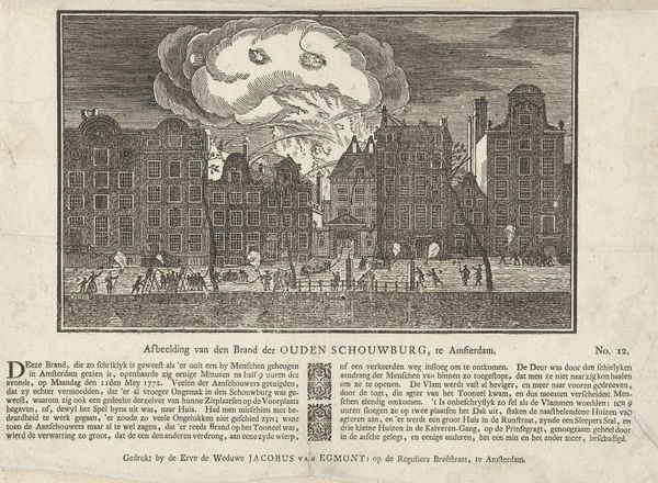 Editor: This etching by Noach van der (II) Meer from 1772, titled "Outbreak of fire at the Amsterdam theatre viewed from Keizersgracht," is incredibly detailed for such a dramatic event. The mood is chaotic, emphasized by the stark contrast between the fire and the night sky. How do you interpret the artist's choice of composition? Curator: Observe how the composition leverages a clear division between the fiery spectacle and the reaction of the gathered populace. The formal structure, with its sharp delineation, doesn’t just depict the scene, it comments on it. Notice the artist's placement of the horizon, its stark separation dividing the composition into two distinct registers. Editor: I see what you mean about the separation. But, what does it mean? Curator: What meaning do you discern in this rigorous separation? Consider how the light and shadow interact. How does the fiery element affect the tone of the print as a whole? Notice the texture created by the etching, specifically the detailed rendering of the fire versus the calmer depiction of the buildings along the canal. The composition creates a story as much about chaos and observation, the way society responds to catastrophe, no? Editor: That’s fascinating. The detailed texture of the fire almost seems to overshadow the architectural detail, drawing the eye upward and then letting it fall to the people, the people being passive witnesses rather than active participants in their own environment. Curator: Precisely. It suggests a kind of spectacle—an observation of disaster, but not necessarily engagement with it. Reflect on how this might connect to wider discussions of social structure during that period. Editor: So, by examining the form and composition, we can actually unpack so much about the potential meanings behind the image! I hadn't thought about it in this way before.