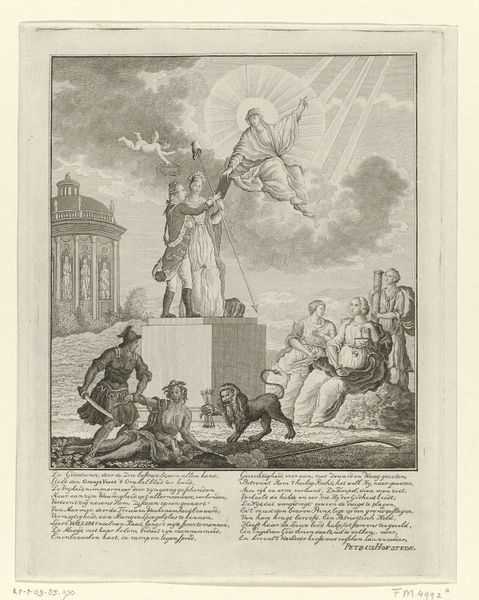 Curator: Looking at this engraving, made around 1780, and titled "Spotprent op de wankele Britse economische positie," which roughly translates to "Satirical print on the unstable British economic position," it immediately strikes me how unstable and precarious everything feels in the image itself! Editor: Exactly! It’s almost comical, this precarious balancing act. There’s this whole floating bed scene being supported—or barely supported—by various characters. A wild mashup of Dutch windmills in the background and rocky cliffs in the foreground. It looks like economic anxiety on acid, if you know what I mean. Curator: It's potent, that’s for sure. You can see in this piece the anxieties surrounding the economic realities for Britain at that time, and it really speaks to those broader historical anxieties that fueled tensions leading up to and during the Fourth Anglo-Dutch War. Editor: Yeah, and I can just imagine the snarky commentary it’s dripping with. Those figures straining under the weight of it all, literally holding up this rather opulent bed. Who are the characters involved? It must mean something... like who is carrying what? It must all add to that message. Curator: Absolutely, if you dig into that symbolic dimension. You notice figures, perhaps allegorical, precariously holding up a bed where a figure—likely representing the British economy—sits rather uncomfortably. Meanwhile, you see Dutch figures on one side weighing the figures down and assisting in an unstable economy on the other side, an implication perhaps? This print offers a critical perspective on that fraught dynamic. The use of satire highlights Britain's weakening financial standing, underscored by military conflicts. Editor: I suppose even centuries later, in a world swamped with information and political intrigue, these sorts of stark visual commentaries cut through all of that noise. What a piece! I wonder how many knew what the artist meant. Curator: I completely agree with the relevance to even today's society! To understand political satire, you have to really know your cultural references. In terms of cultural and artistic output, it shows me, yet again, the deep power and complexity of that moment of political discourse and artistic creativity that art, such as this, still unlocks.