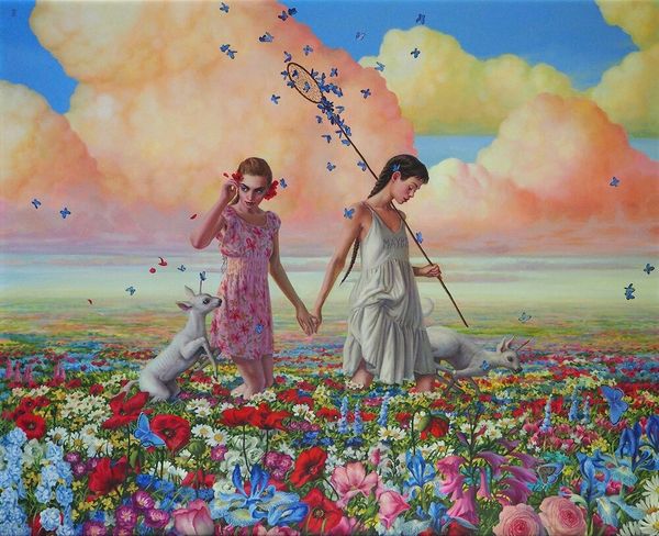 Editor: Vicente Romero’s oil painting, "Untitled #18," shows two women in a field. They seem like figures in a dream. What can you tell me about it? Curator: Looking at this from a materialist perspective, the first thing that strikes me is the artist’s choice of oil paint itself. It allows for the soft blending and almost ethereal quality. Consider, too, the labour involved in creating this vision of leisure. How does Romero's application of paint – its textures, its visible brushstrokes – connect to the broader social context of art production and consumption? What kind of relationship between production and art? Editor: It's interesting to think about labour involved in the work that depicts something so leisurely. I guess I just saw it as beautiful, and didn't think about production so deeply. Curator: Precisely. The visible brushstrokes remind us of the artist's hand, of their physical engagement with the canvas. Oil paint wasn't accessible for just anyone, who do you imagine could commission artwork like this one? Does that influence how you view it at all? Editor: Probably only the upper classes. It makes me consider it as a commodity of that class. Are the romantic overtones then, just a means to appeal to the wealthy? Curator: It's plausible. Now consider the plein-air approach: what are the socio-economic implications of transporting materials and setting up outdoors versus the controlled environment of a studio? Also, what implications might these choices have had? Editor: I hadn’t thought of that logistical side of it before! So, by examining these elements – the materials, the artist's labour, the potential patronage – we gain a richer understanding of the artwork beyond its surface appearance. Curator: Precisely, you now recognize that materials can hold many significations within the history of their usage, impacting our views in the modern day. Thank you!